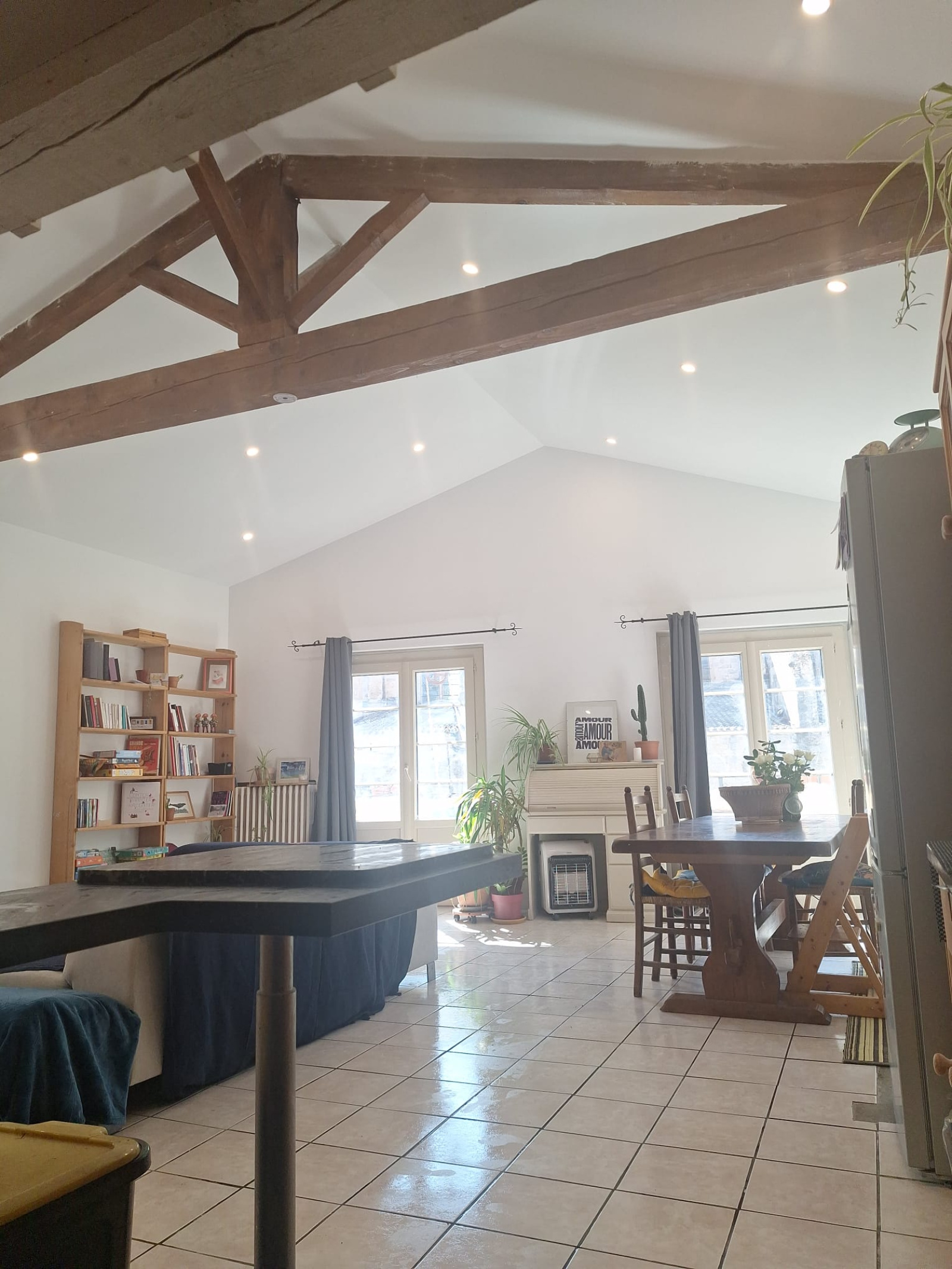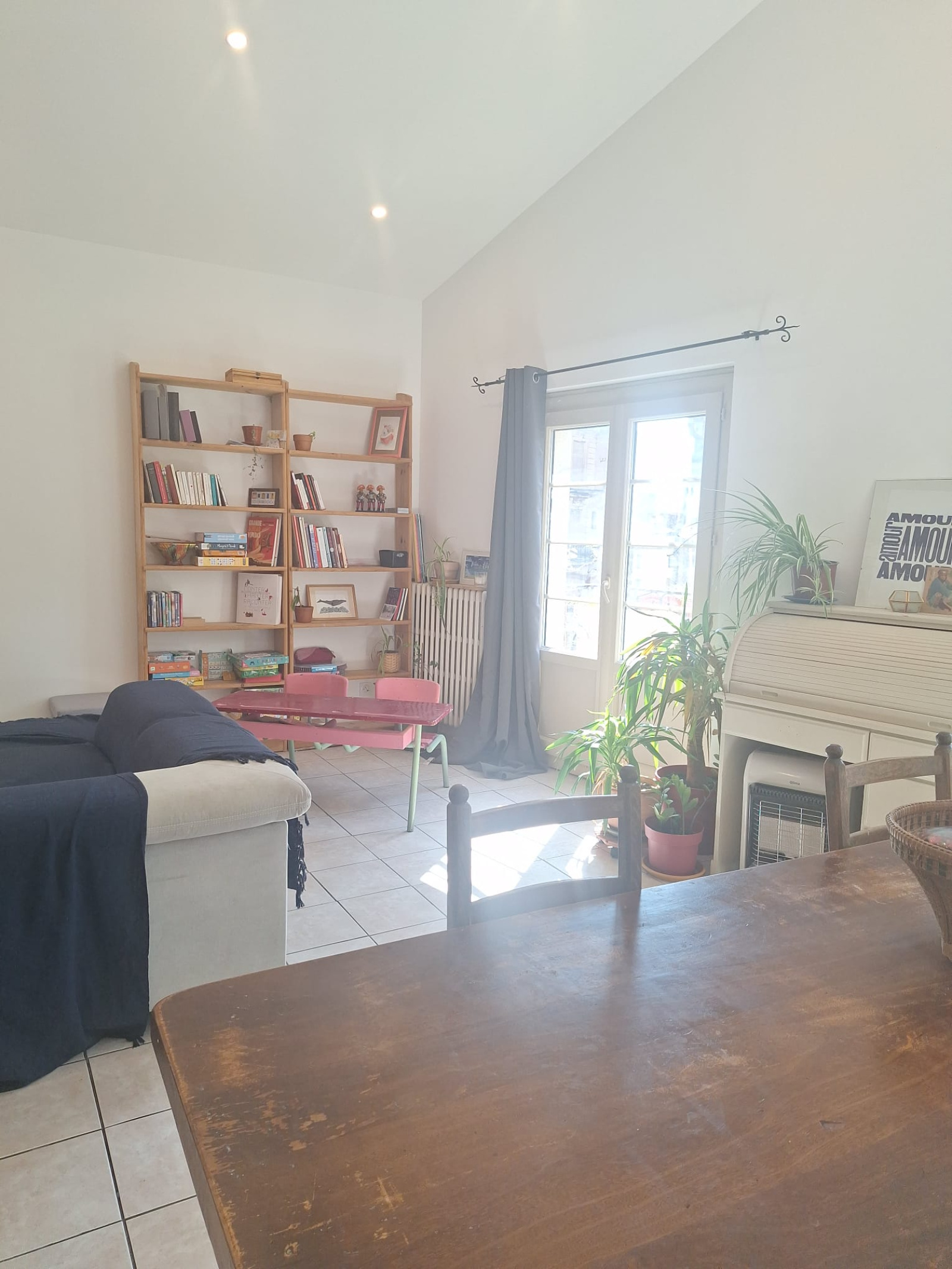 pièce à vivre lumineuse de 45m² avec cuisine américaine et petit balcon