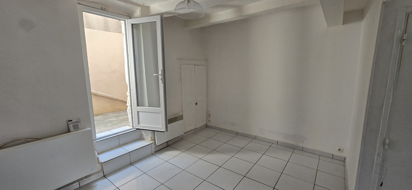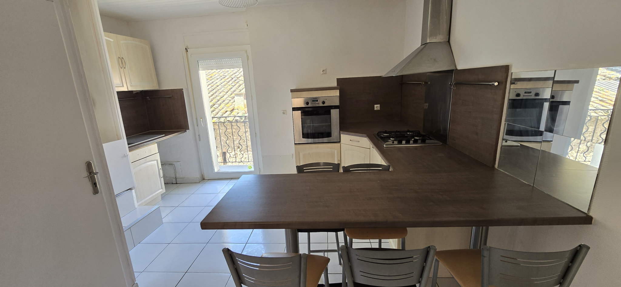 Une pièce de vie lumineuse de 23 m² avec cuisine américaine aménagée (hotte, four, plaque gaz), ouvrant sur un balcon et une petite cour intérieure.