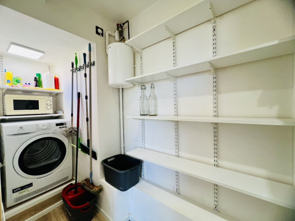 L'appartement se compose d'un hall d'entré deservant une grande pièces de vie ouverte regroupant le salon, une salle à manger, une cuisine totalement équipée et un cellier.