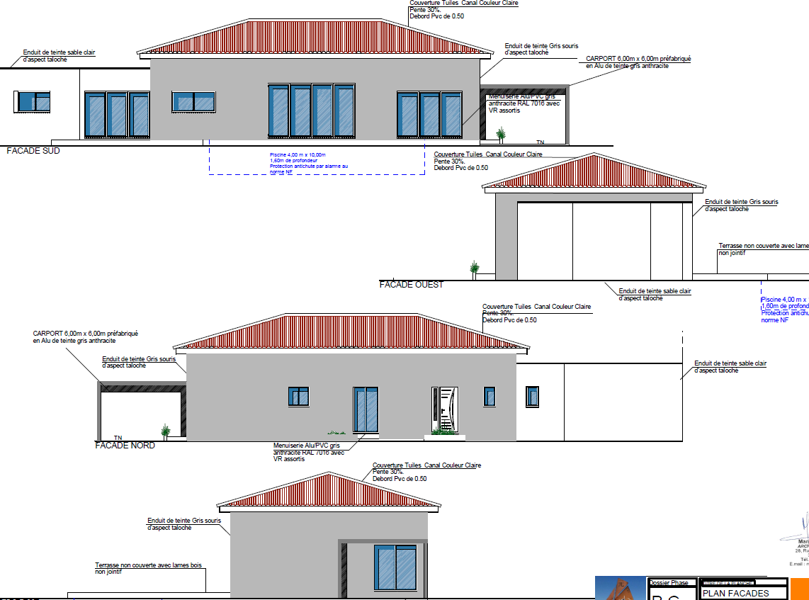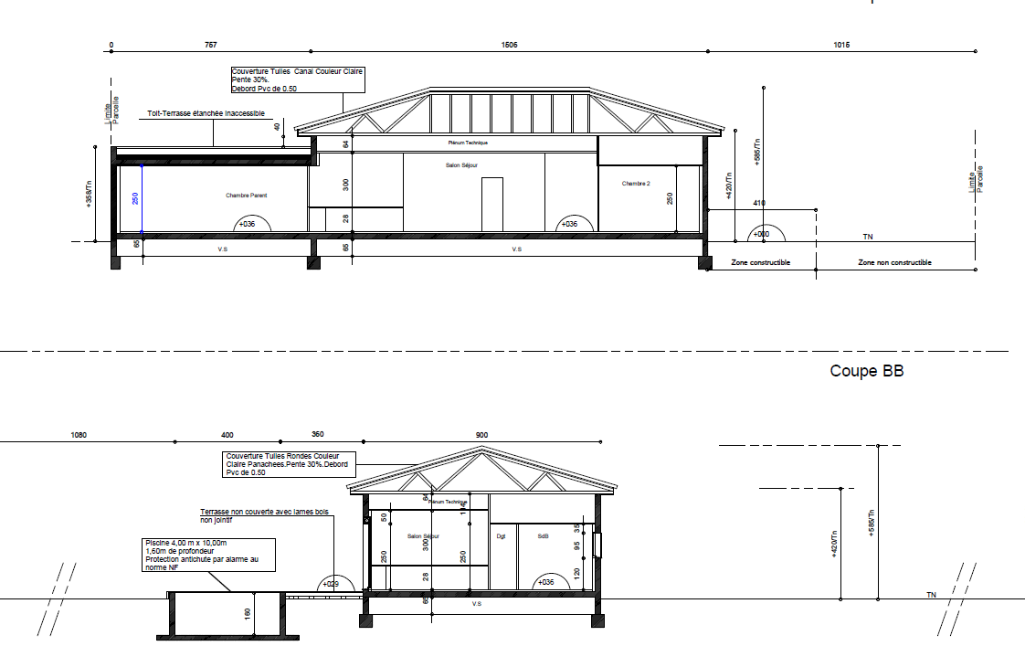 Un permis de construire a été accepté, un plan d'architecte est egalement disponible pour une villa de plain pied de 160m² environ.