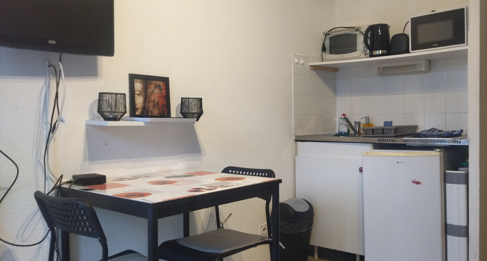 Une pièce à vivre avec cuisine équipée ( plaque éléctrique , four , mico onde , cafetière , frigo top ) , lit deux personnes , ainsi qu'une salle d'eau avec son toilette , il dispose également d'un balcon idéal pour prendre son petit déjeuner en toute tranquilité.