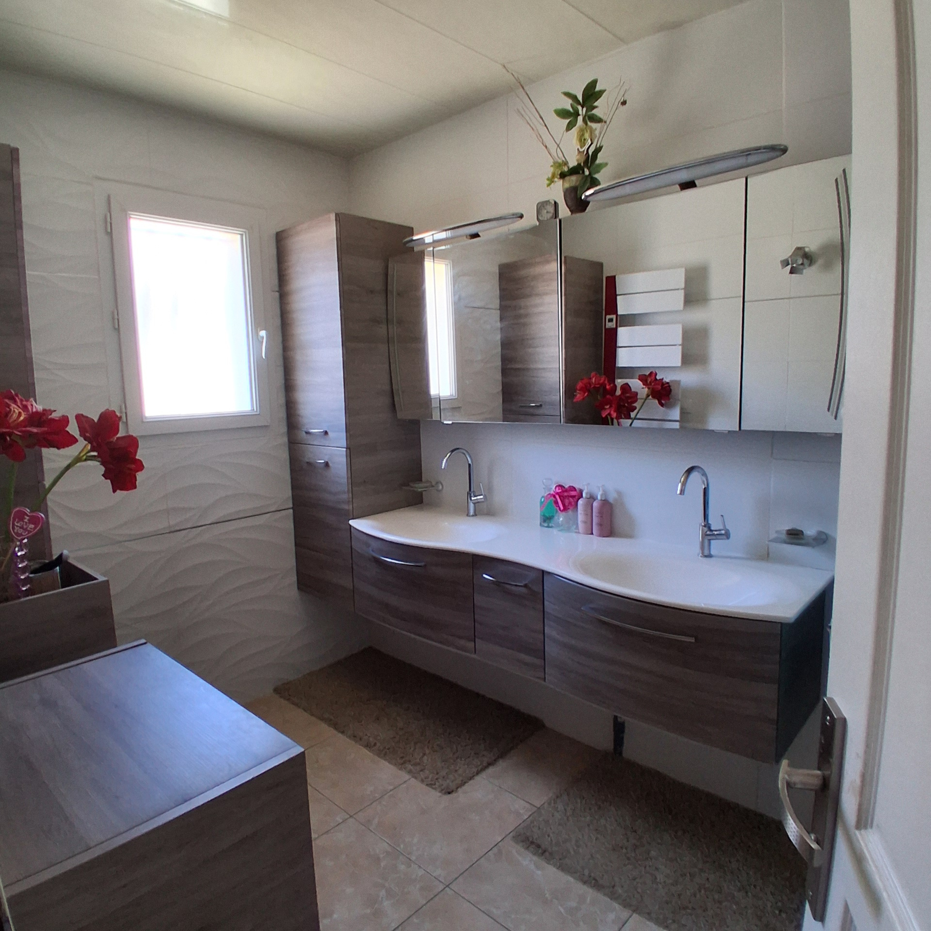 La villa est composée d'une grande pièce de vie lumineuse de 60 m² avec cuisine ouverte, donnant directement sur la terrasse. Côté nuit, trois chambres, un bureau, une salle d'eau et un wc indépendant. Un.garage de 23 m2 vient compléter ce bien.