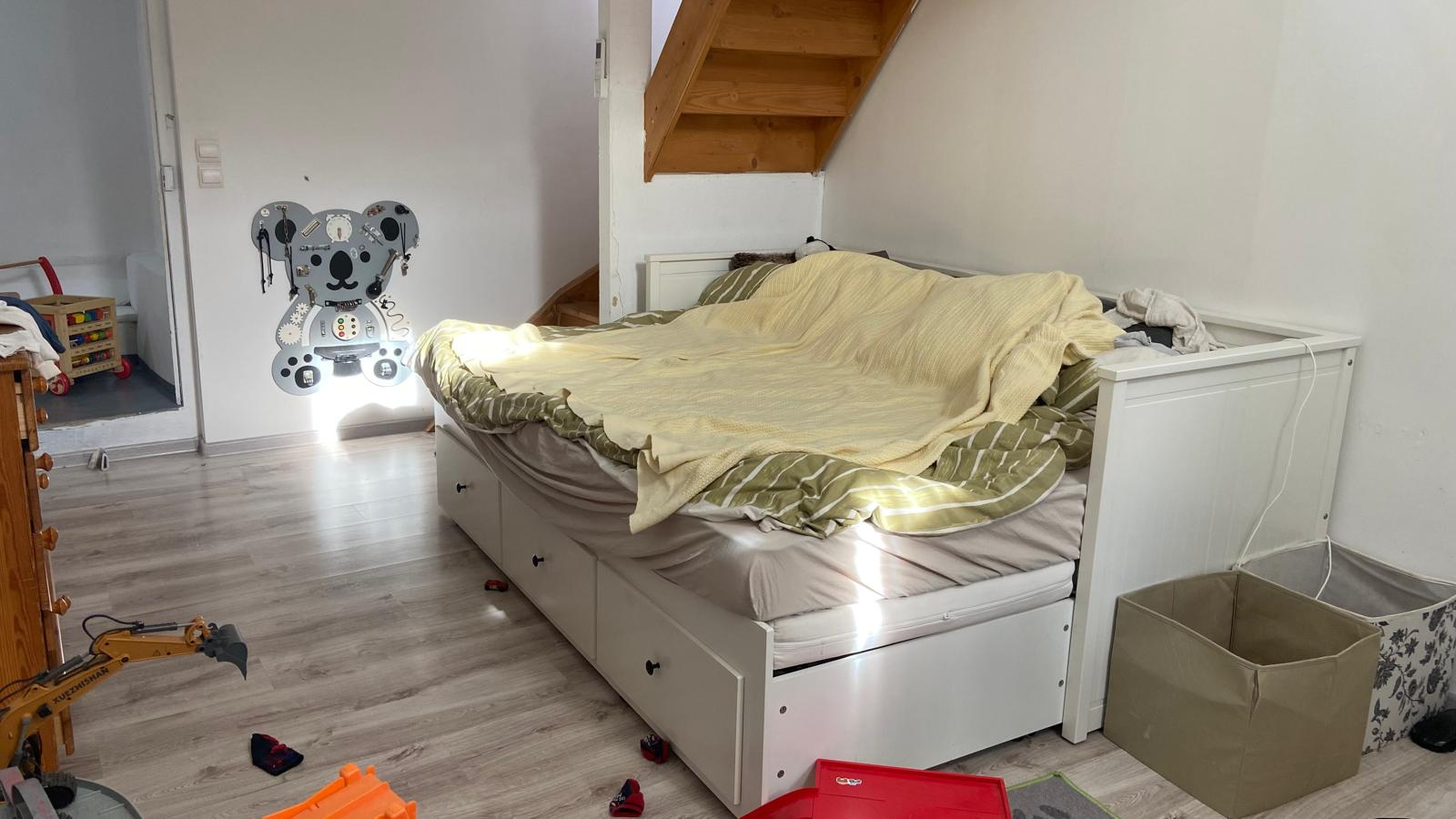 À l’étage, un palier dessert une salle de bains avec WC de 4,45 m², une première chambre de 12,13 m², puis une seconde chambre d’environ 15 m² avec mezzanine de 6,73 m², offrant un espace supplémentaire pour un coin nuit, un bureau ou une salle de jeux. Des rangements intégrés optimisent l’ensemble.