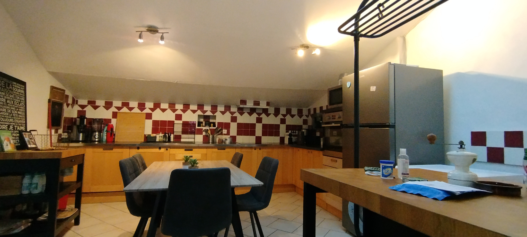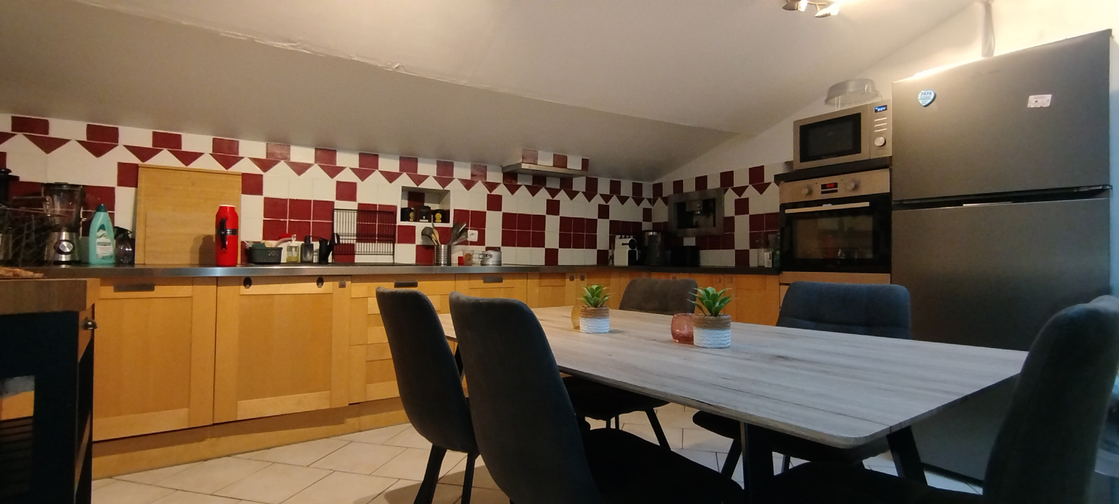 La cuisine équipée et fonctionnelle s'ouvre sur une belle pièce de vie conviviale .