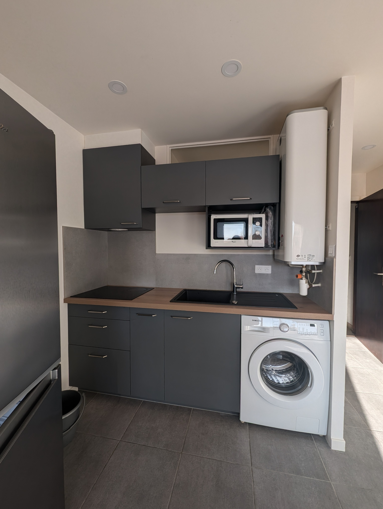 Le logement est entièrement meublé et équipé : cuisine aménagée avec tout l'électroménager et les ustensiles de cuisine nécessaire, un coin salle à manger avec table et chaises, un lit deux places.