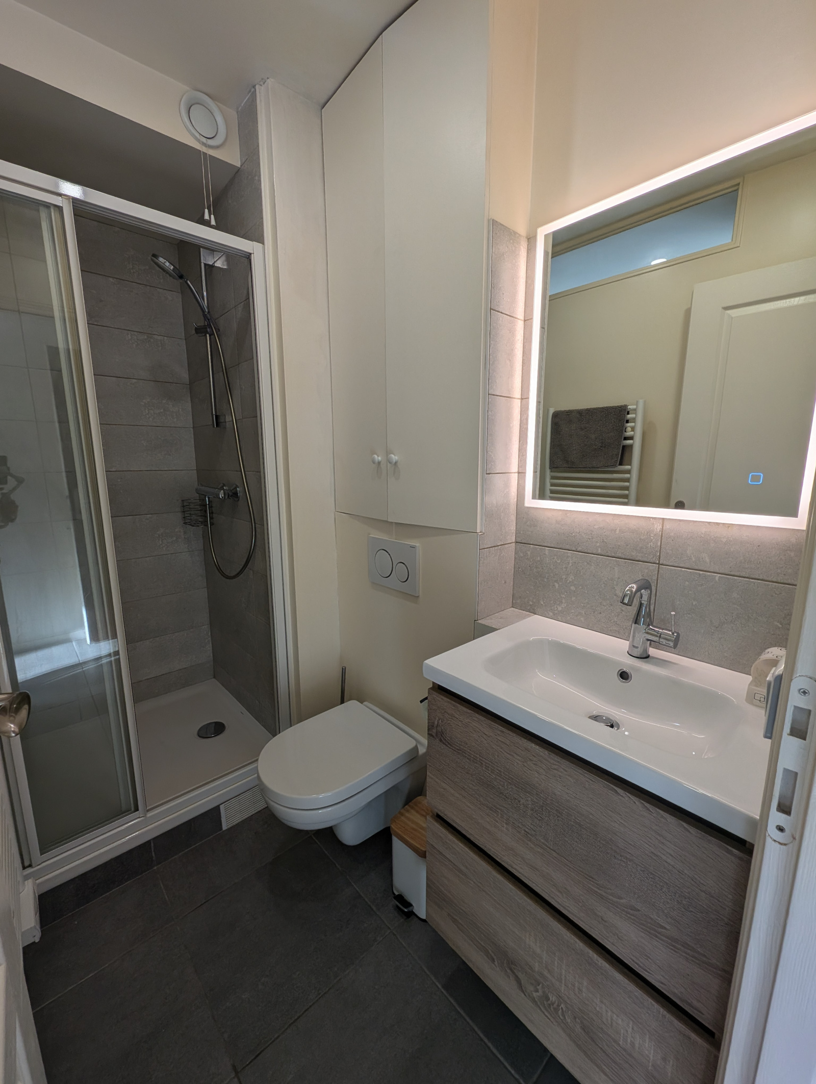 Côté sanitaires, une salle d'eau moderne et très propre avec WC et meuble vasque.