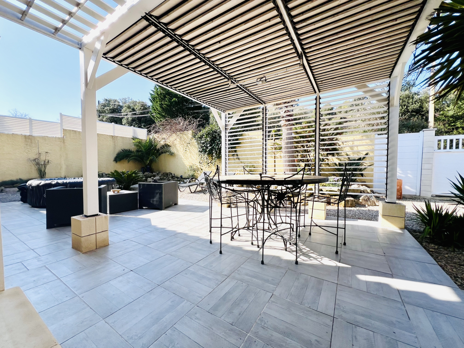 À l’extérieur, une terrasse agrémentée d’une pergola bioclimatique prolonge harmonieusement les espaces de vie. La double exposition Est/Ouest assure un ensoleillement optimal tout au long de la journée, tandis que la vue dégagée sur les montagnes offre un cadre naturel particulièrement appréciable. Le terrain permet également l’implantation aisée d’une piscine.