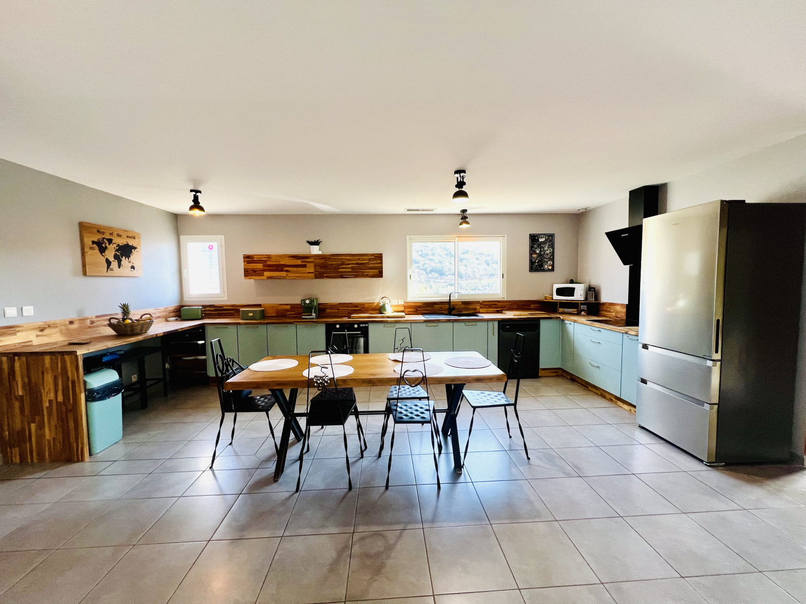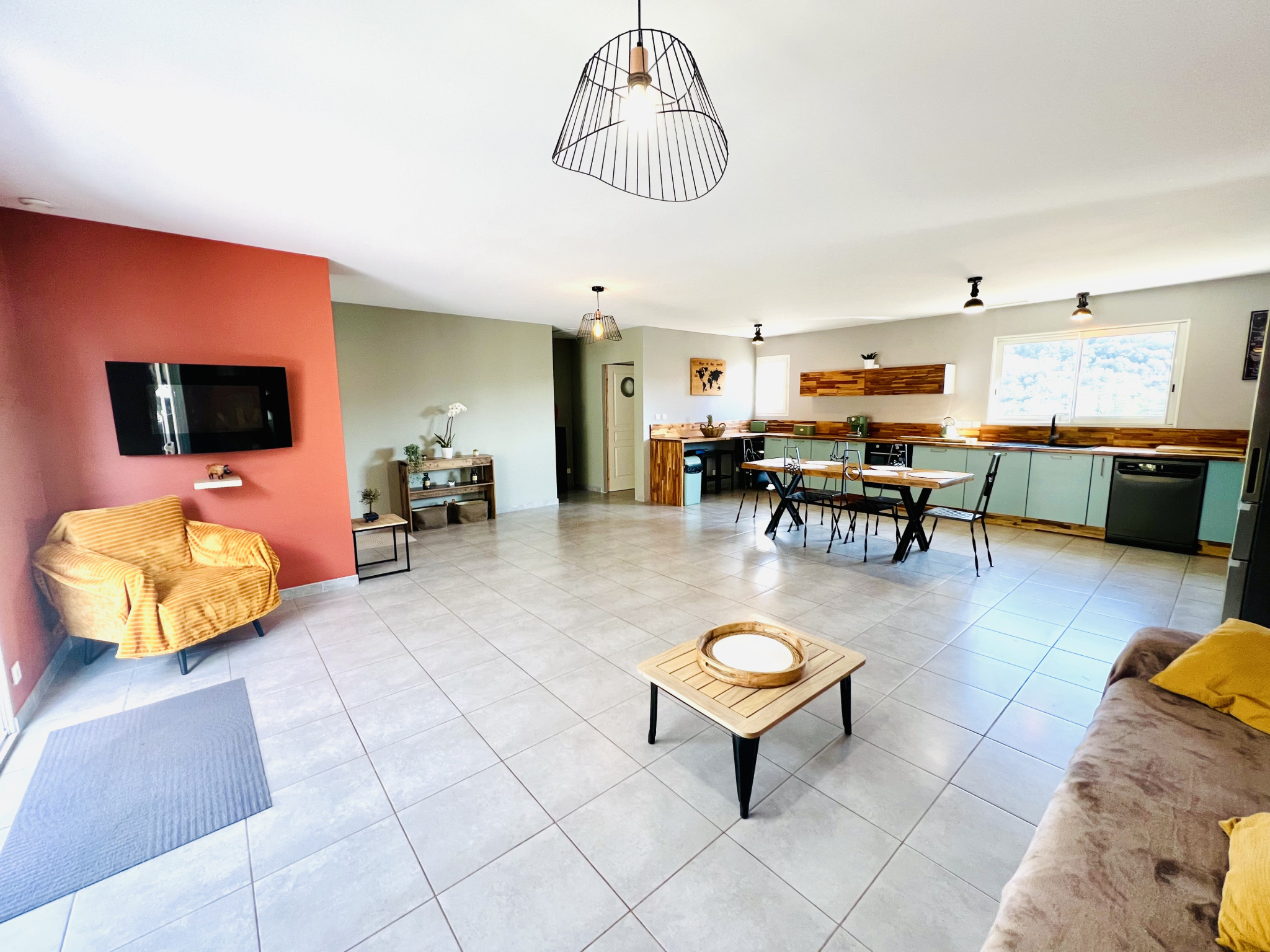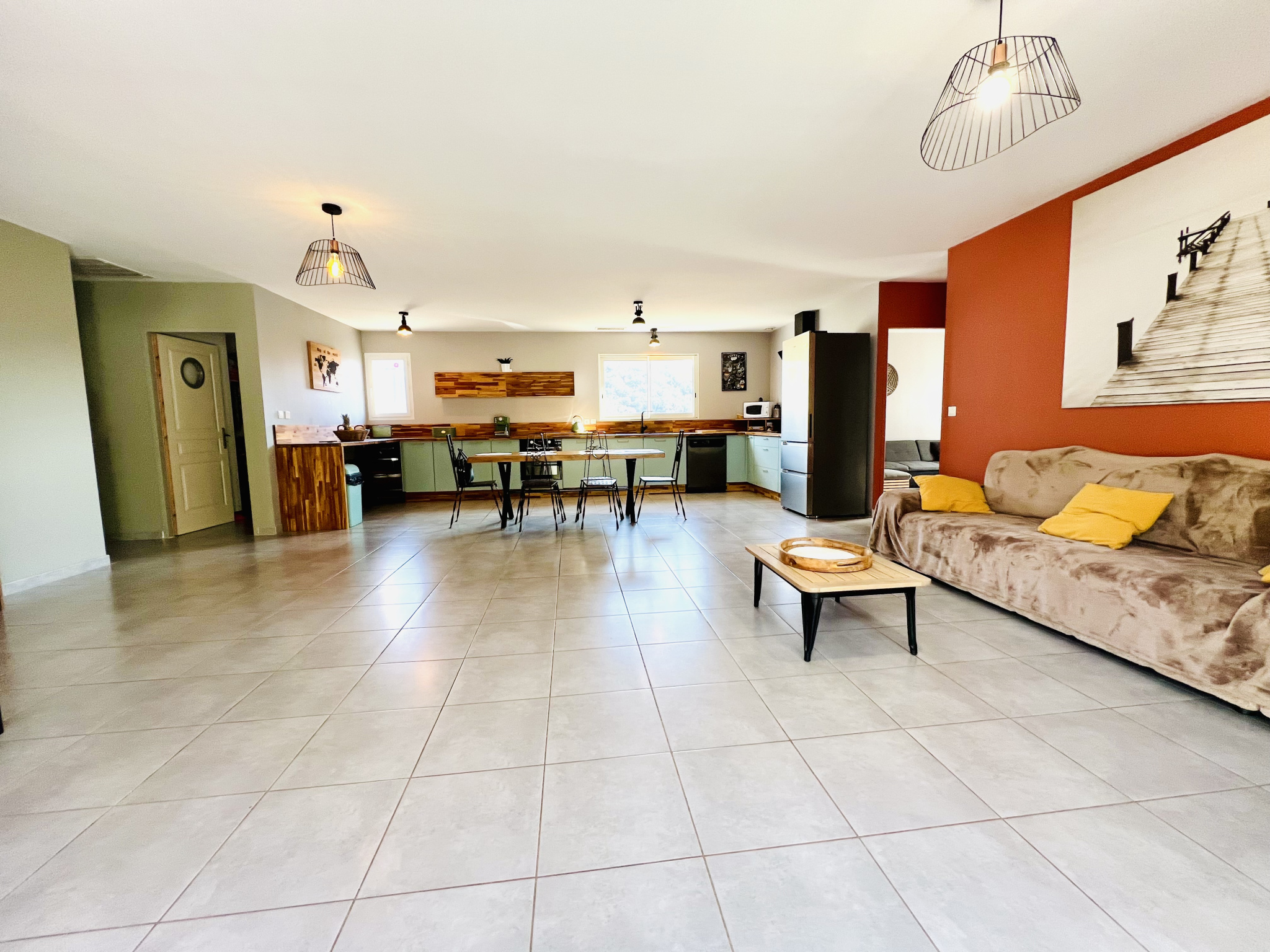 L’espace de vie principal, d’une superficie de 58 m², propose un séjour lumineux avec cuisine ouverte entièrement équipée. Fonctionnelle et conviviale, cette pièce centrale est parfaitement adaptée à la vie de famille et à la réception.