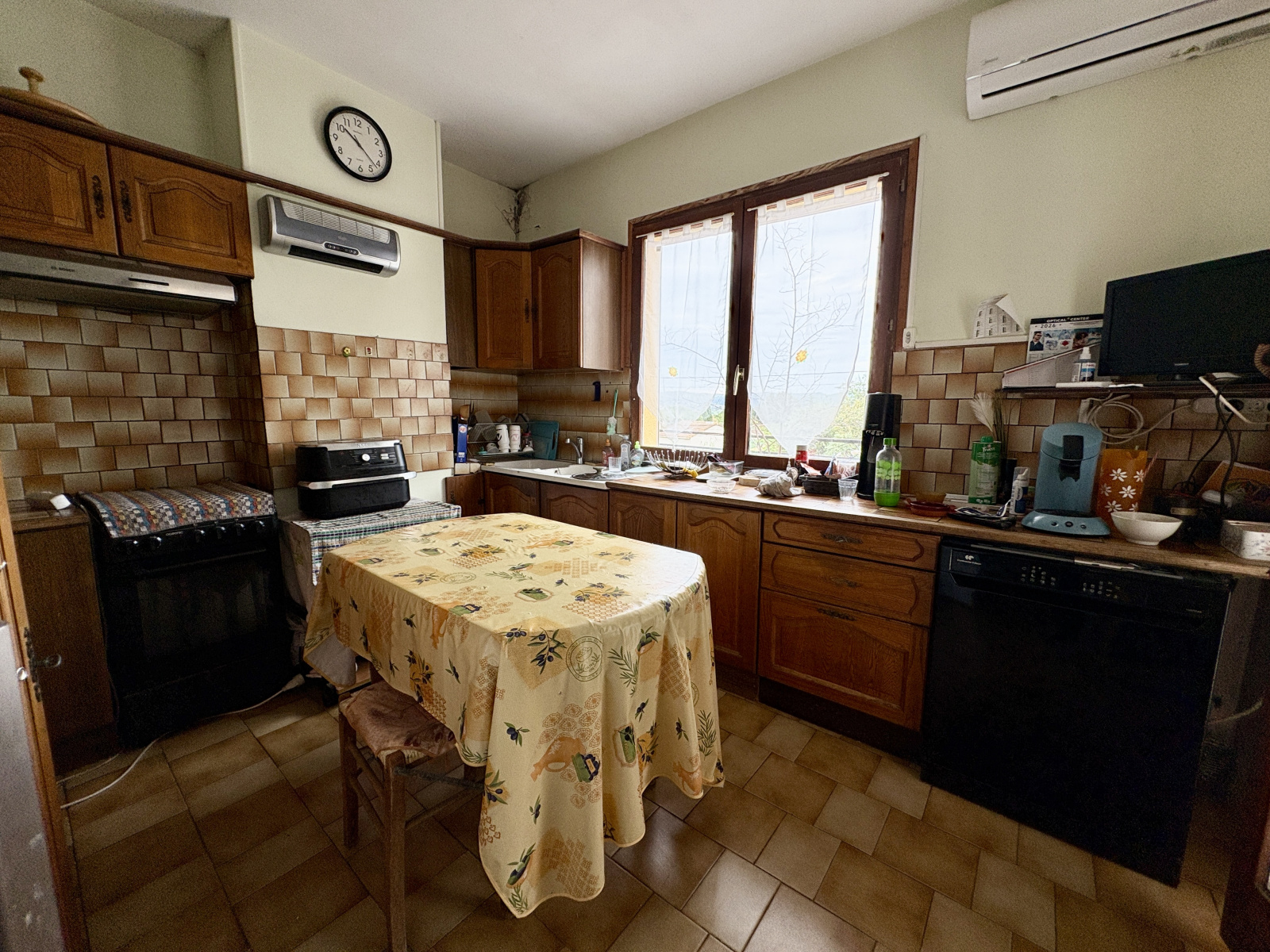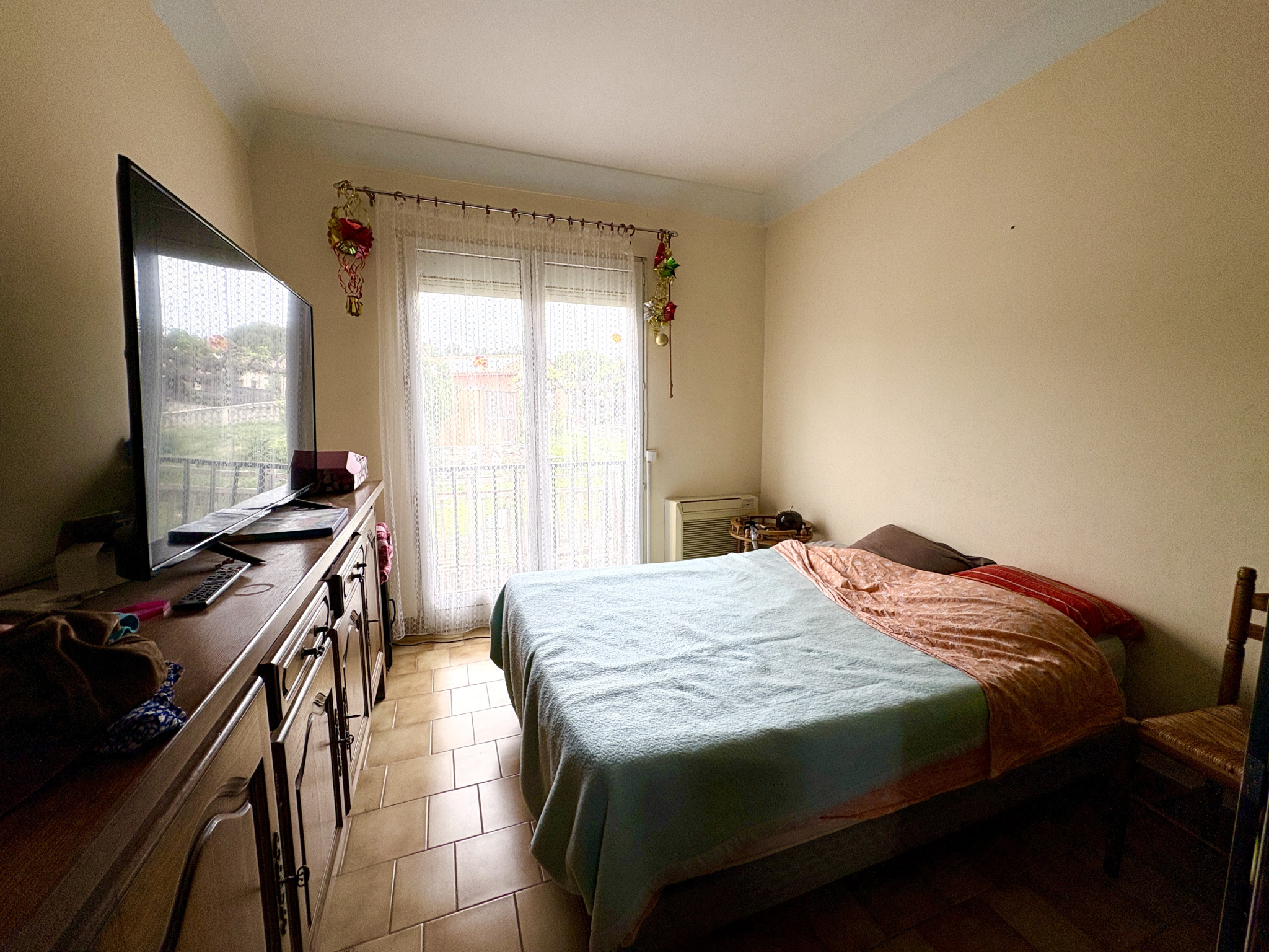 Au rez-de-chaussée, un appartement de type 3 d’environ 80 m², actuellement loué 750 € par mois. Le logement est en bon état général et ne nécessite pas de travaux particuliers. Il dispose d’un poêle à bois, de menuiseries en double vitrage et de convecteurs électriques.