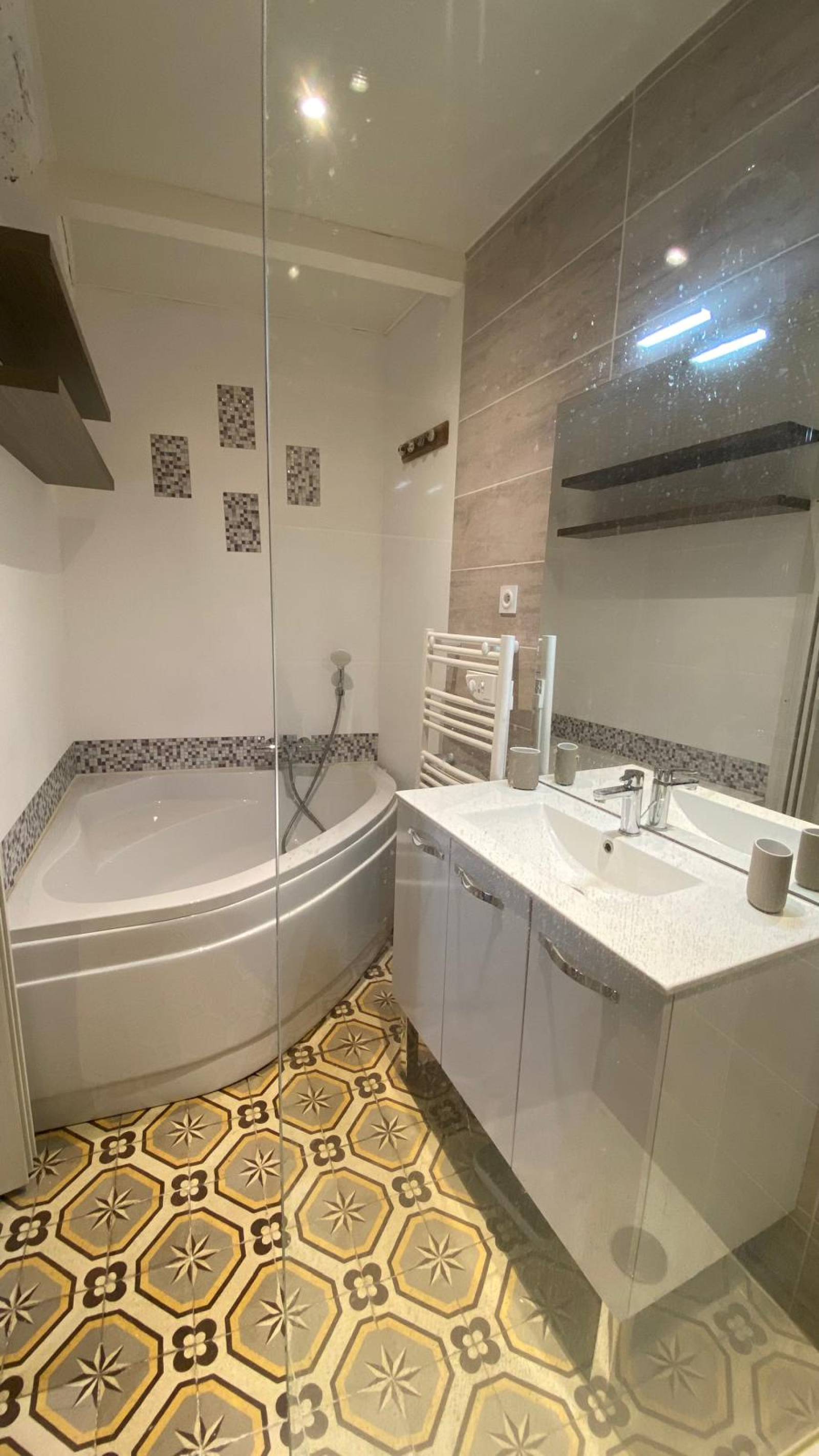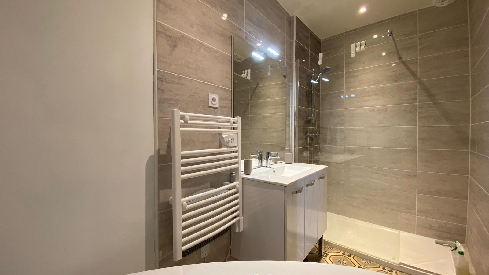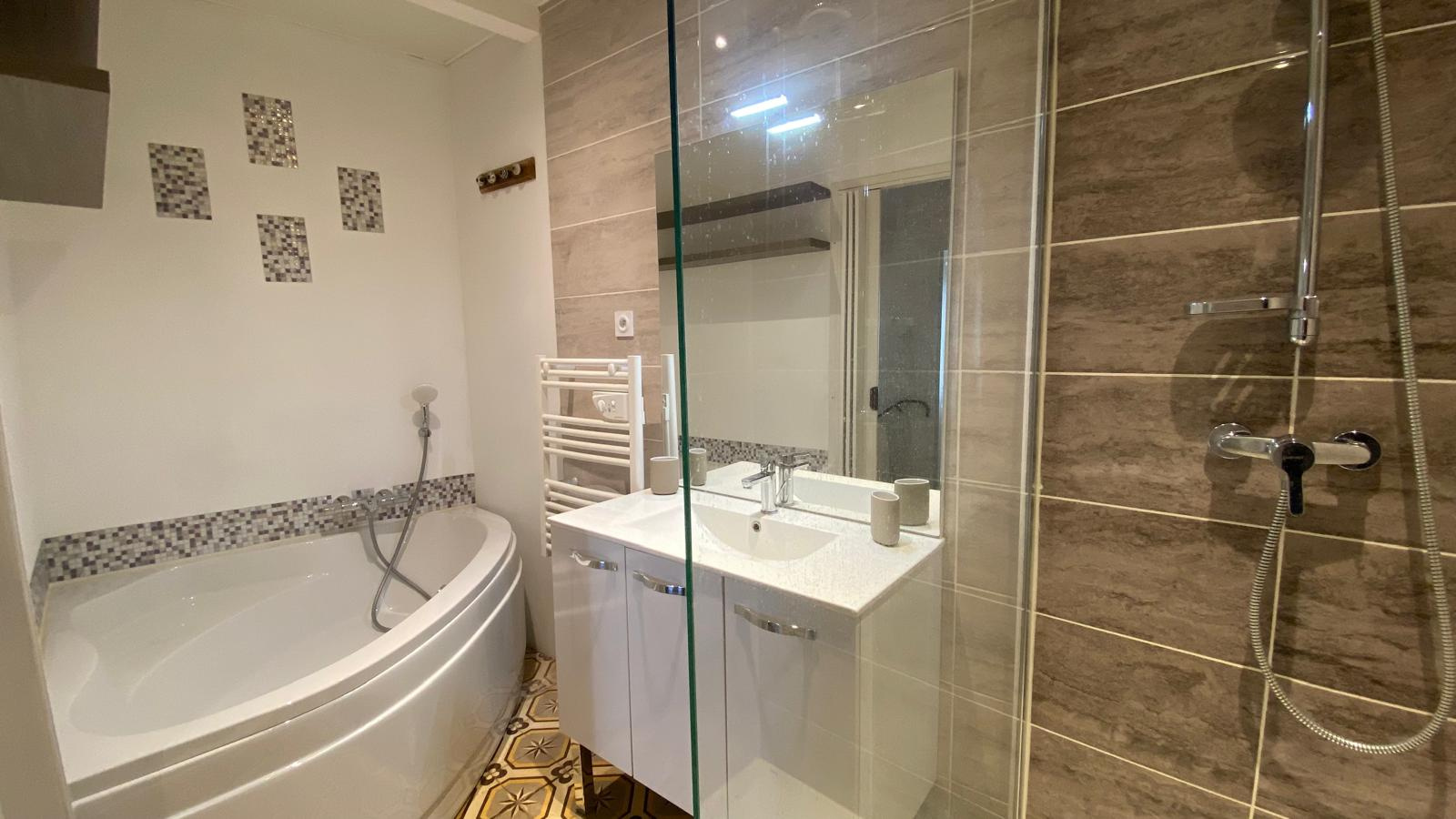 Au 1er étage, vous profiterez d’une chambre confortable climatisée, d’une salle de bains avec baignoire d’angle et douche, ainsi que d’une buanderie avec WC.