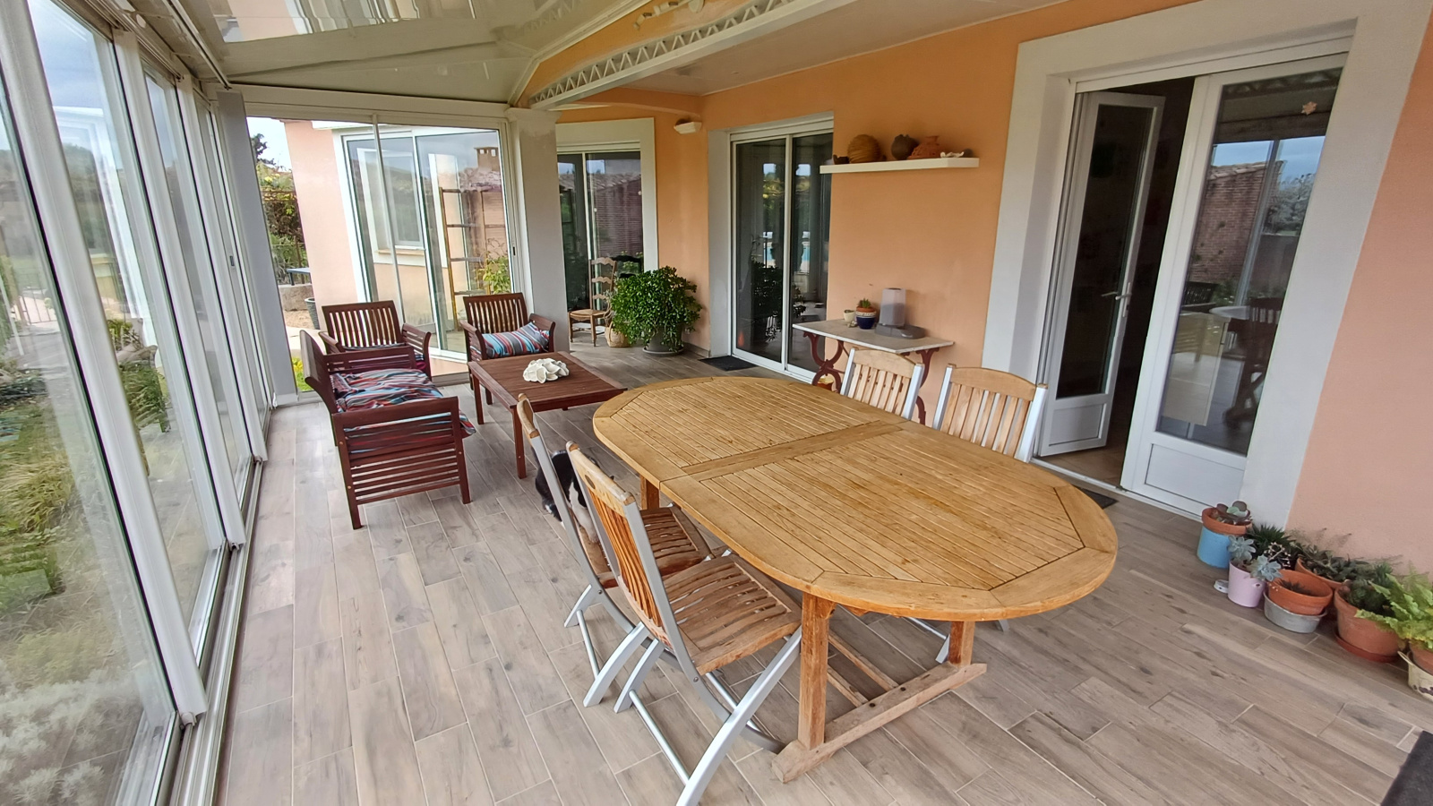 Dès l’entrée, on découvre une pièce de vie lumineuse d’environ 32 m², prolongée par une véranda 4 saisons de plus de 26 m², parfaite pour profiter de l’extérieur en toute saison. La cuisine équipée, fonctionnelle, est complétée par une arrière-cuisine pratique.