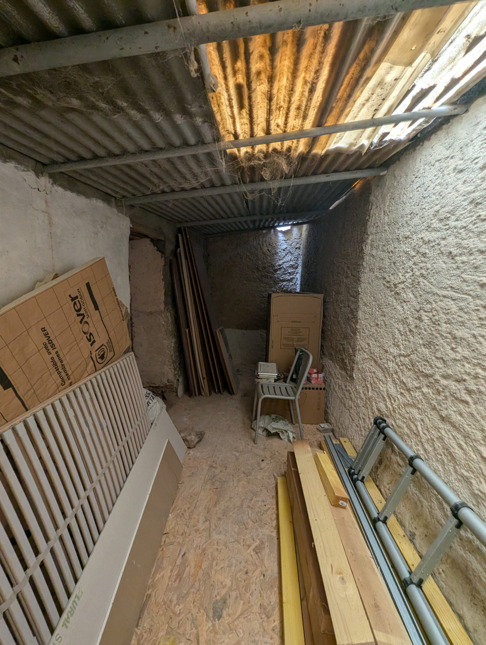 Travaux restant à faire : isolation du toit, finir placo du 1er étage, peinture, sol, créer des ouvertures au RDC pour plus de luminosité, remplacement de la porte d'entrée, création cuisine et salle d'eau, placo, isolation, électricité, peinture et sols du RDC.