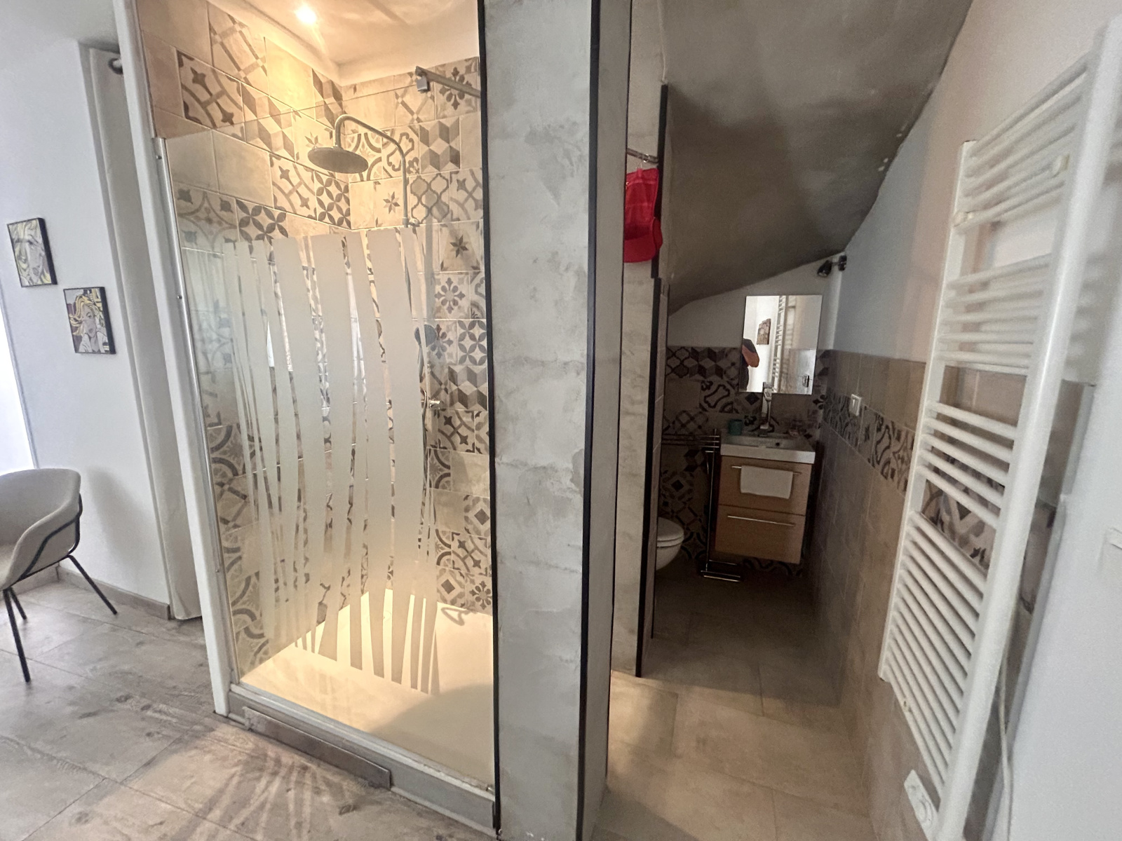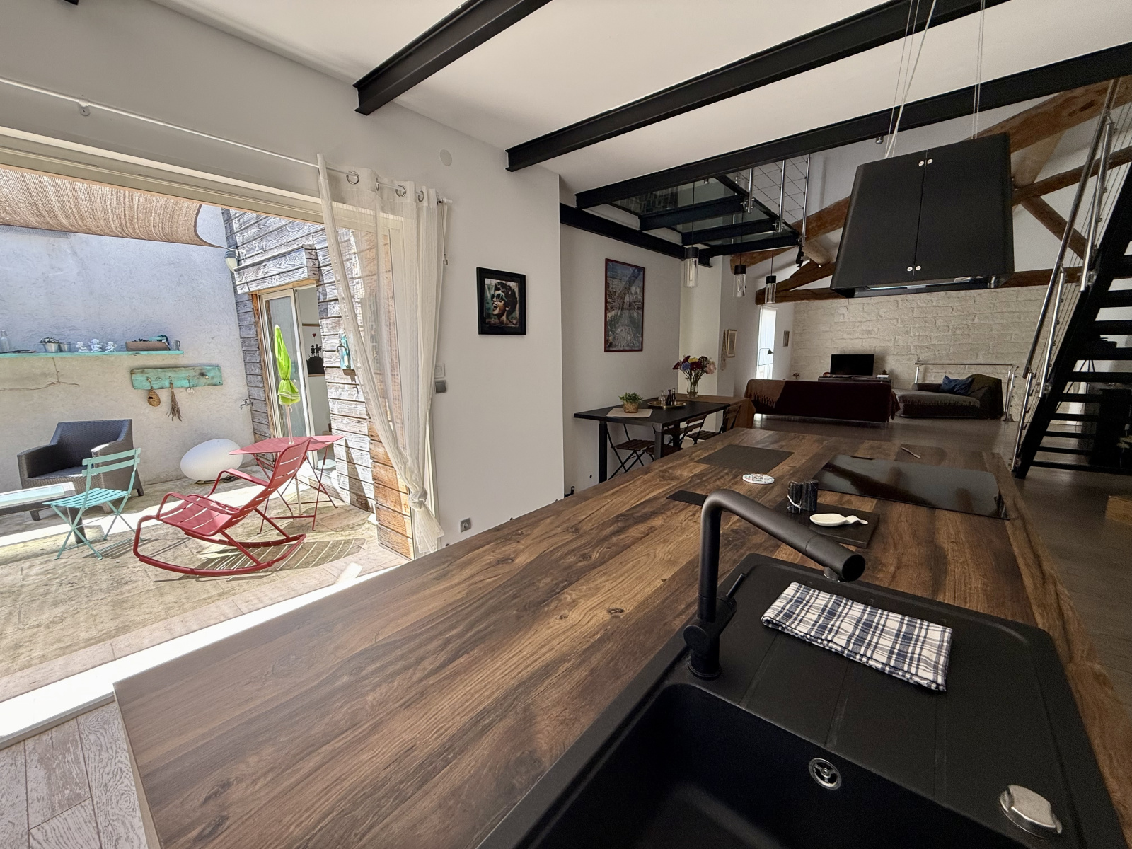 Au 1er étage : une magnifique pièce de vie avec cuisine ouverte totalement équipée donnant accès à un bel extérieur intimiste.. Une chambre avec accès à la terrasse.