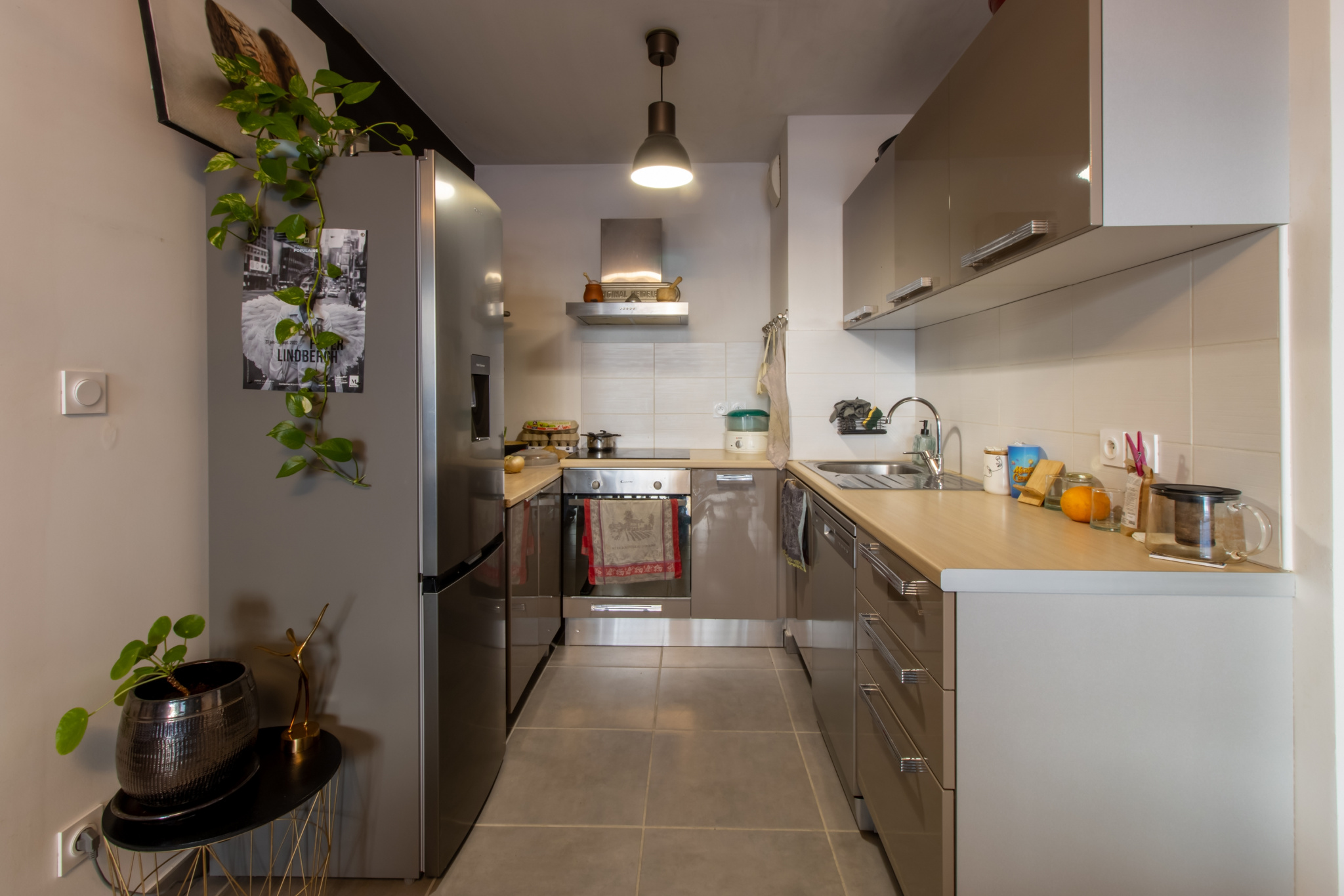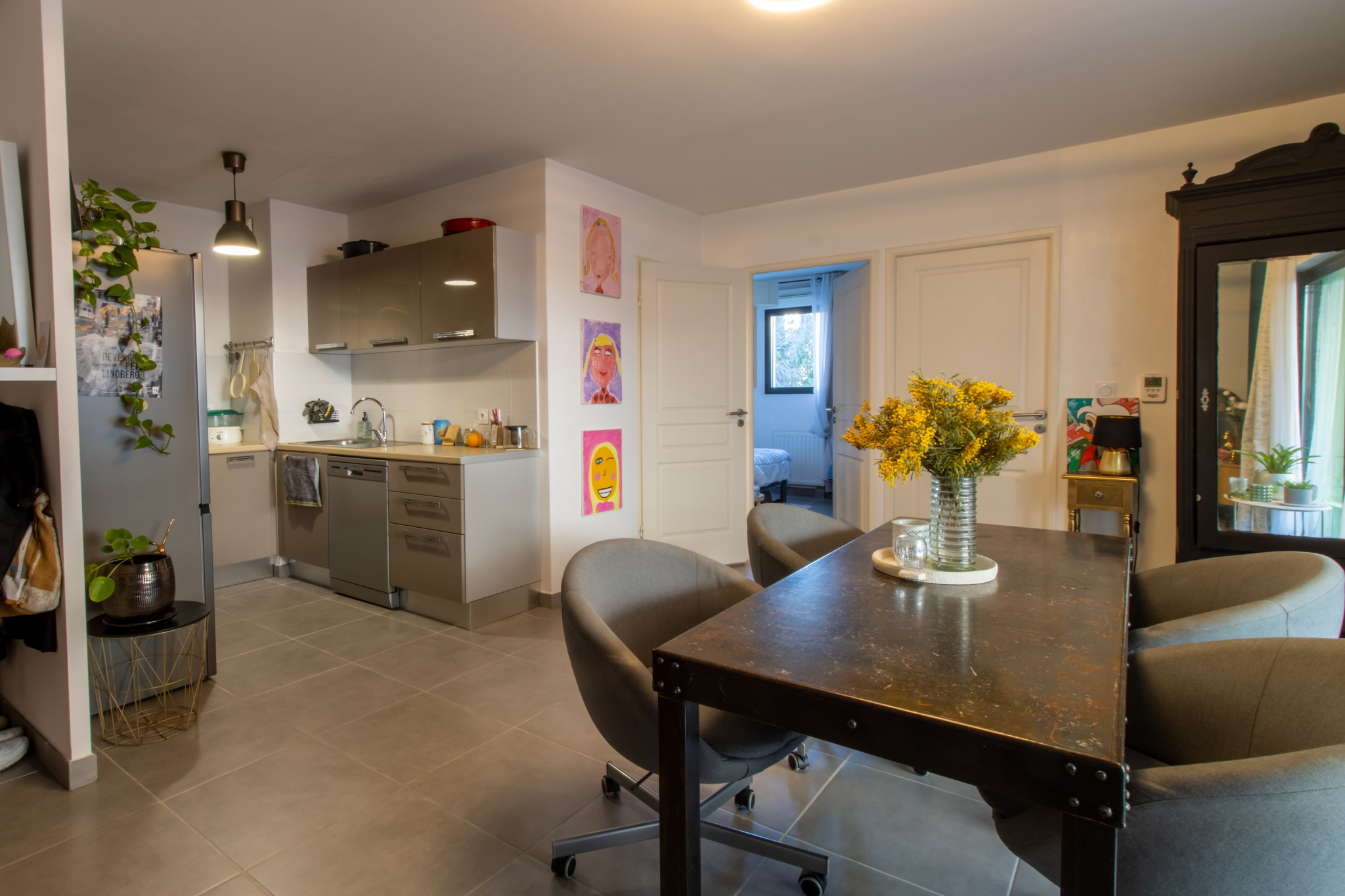 La cuisine, entièrement équipée, s’intègre avec harmonie dans l’espace de vie, offrant fonctionnalité et convivialité. L’appartement propose également deux chambres, bien agencées, permettant d’accueillir un couple, une petite famille ou encore de créer un espace bureau selon vos besoins.