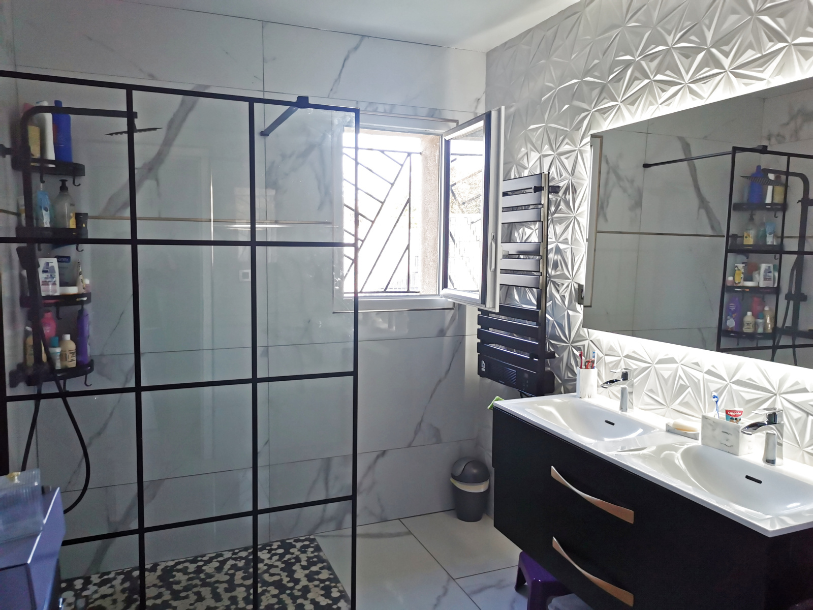 Elle se compose d'une cuisine équipée avec un frigo américain, plaques à induction...ouverte sur un séjour très spacieux. Vous y trouverez trois chambres dont une de 15m², une salle d'eau avec douche à l'italienne et un WC.