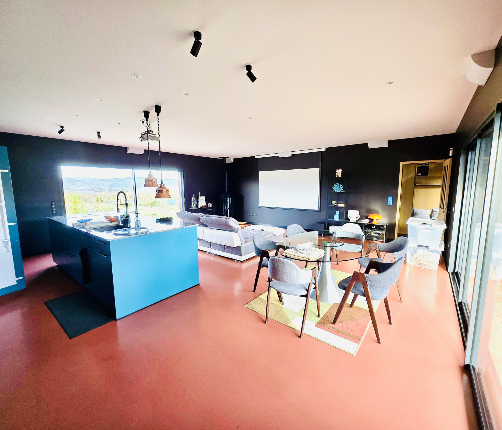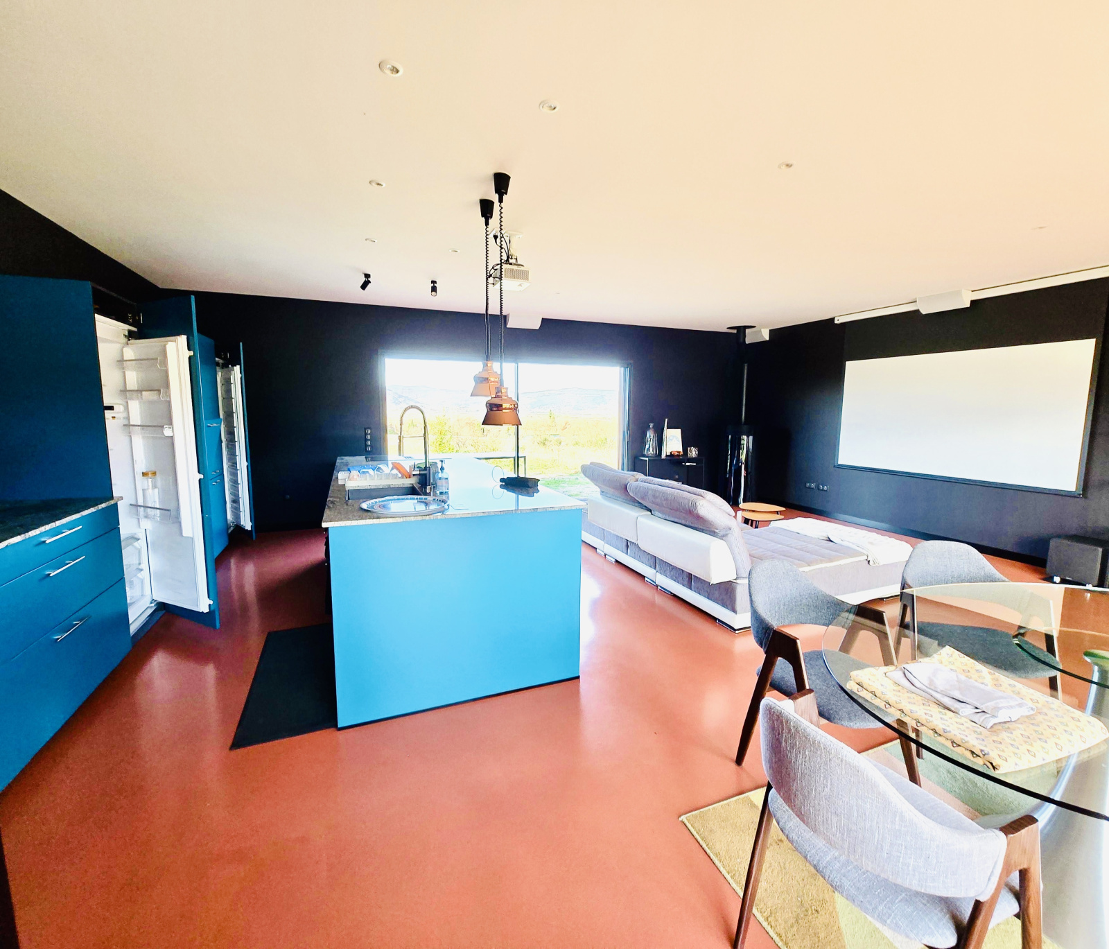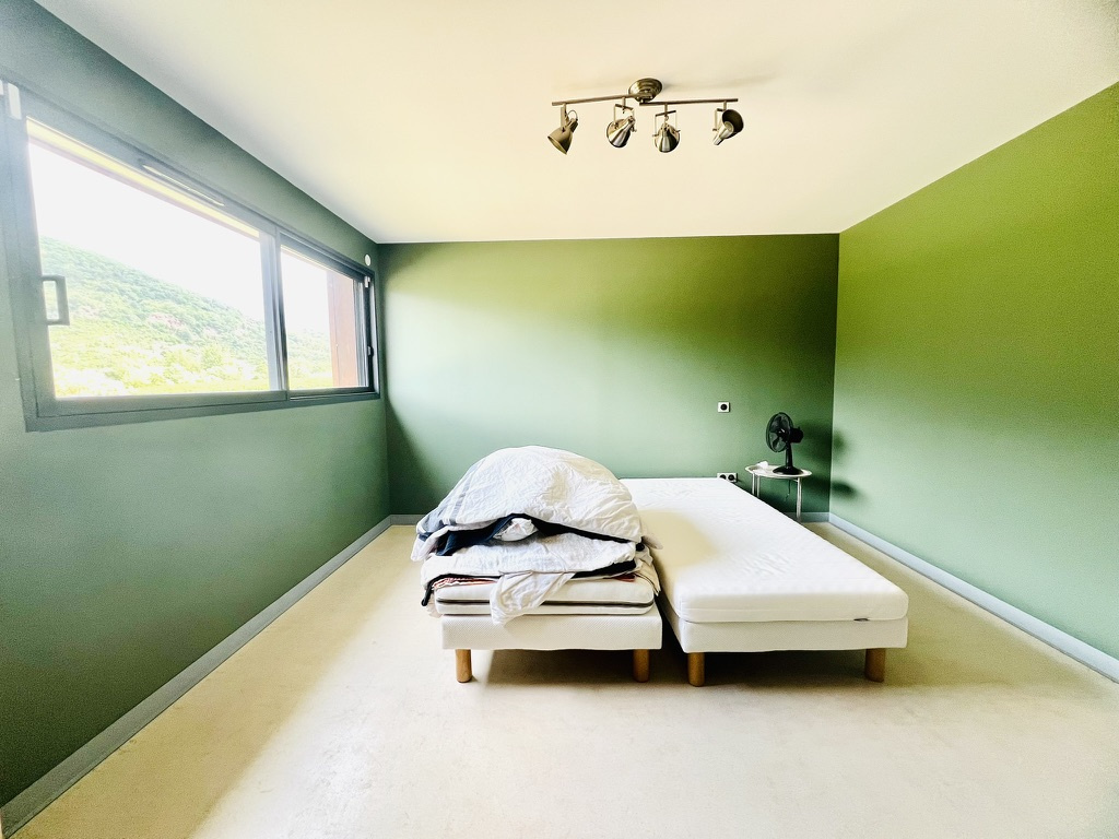 La propriété offre une pièce de vie spacieuse et lumineuse de 50 m², comprenant salon, salle à manger et cuisine ouverte entièrement équipée. L’ensemble s’ouvre sur les extérieurs, bénéficiant d’une vue dégagée et imprenable sur un cadre naturel remarquable.