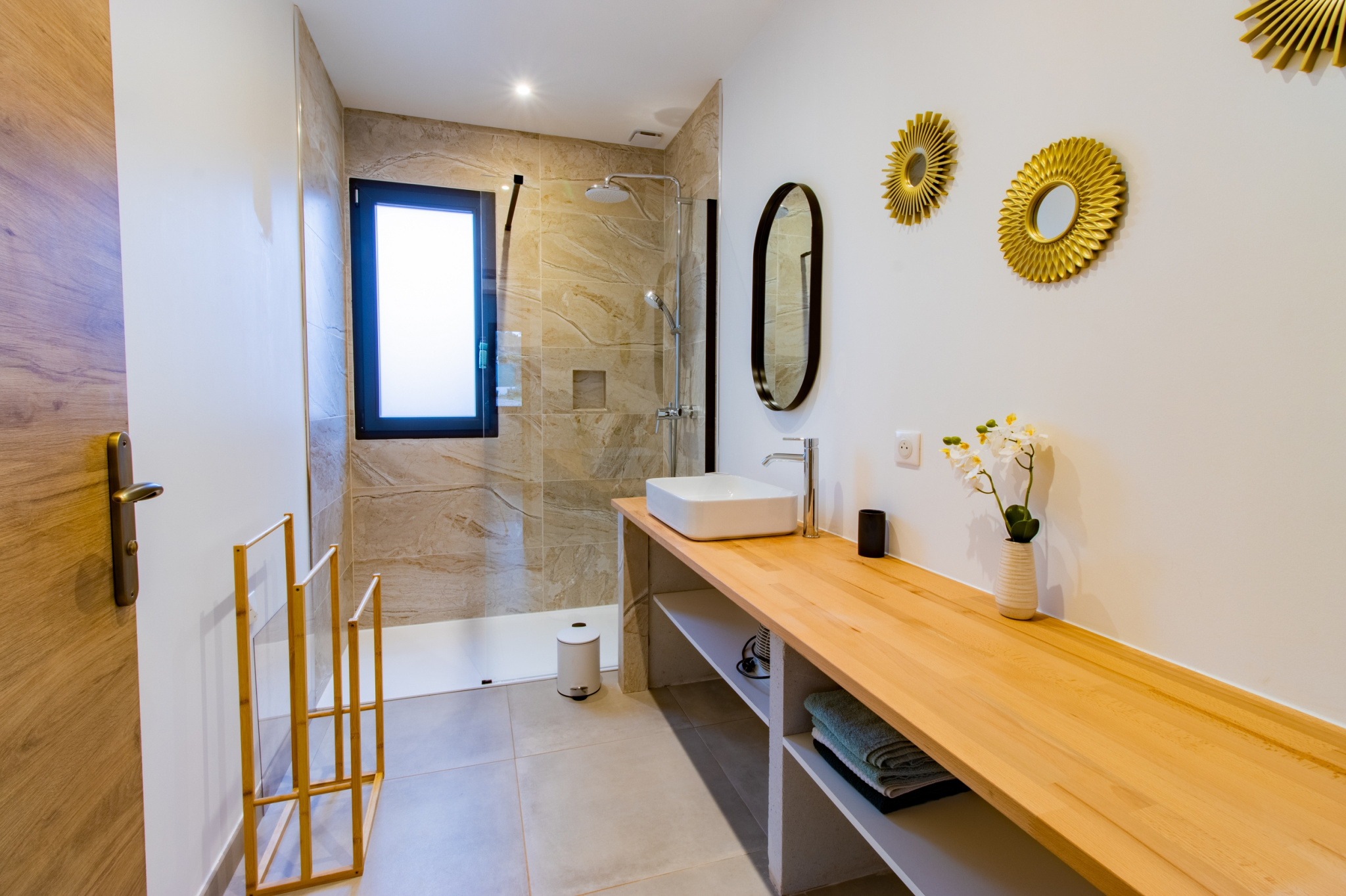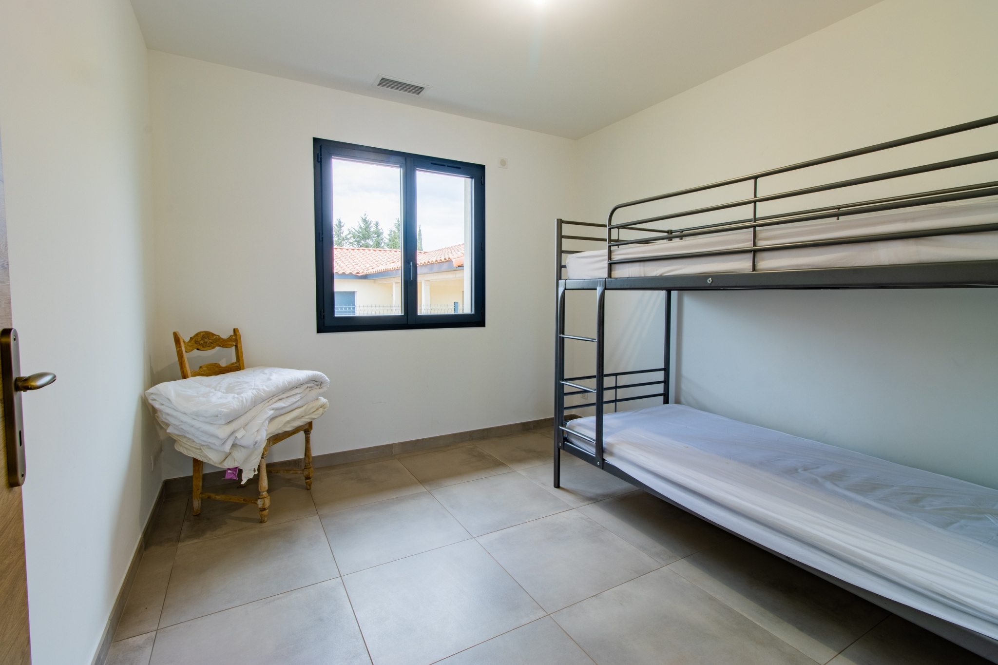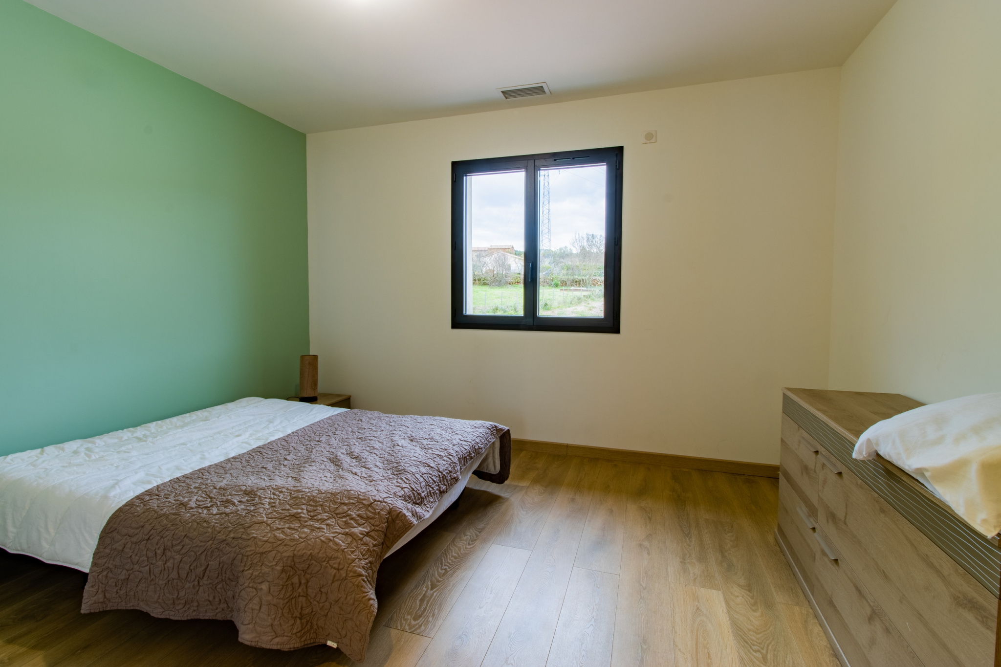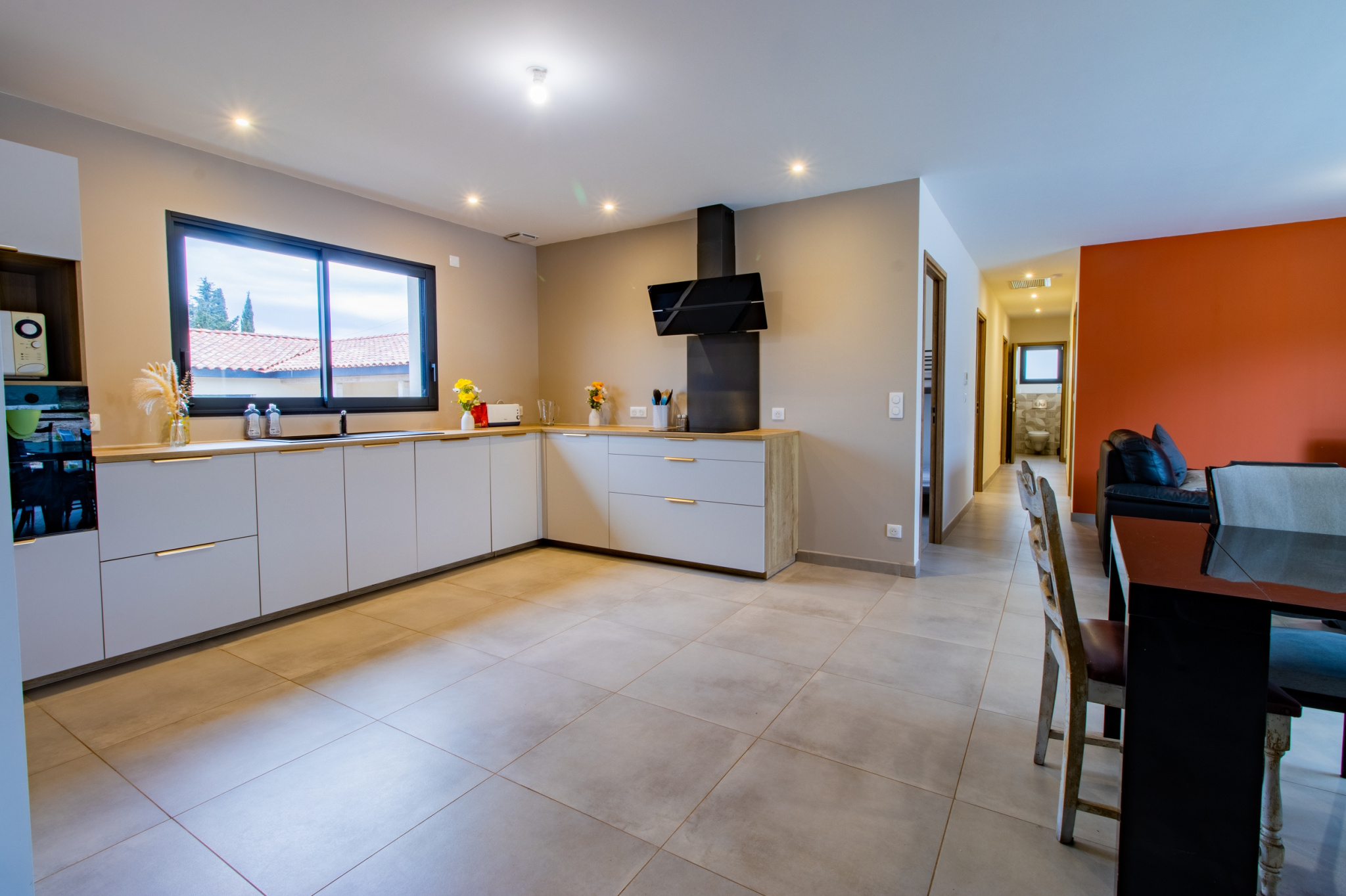 Les matériaux et équipements ont été choisis avec soin : carrelage grand format 60x60, cuisine SoCook entièrement équipée, chauffage par climatisation gainable Atlantic, production d’eau chaude assurée par un ballon thermodynamique de la même marque. La maison dispose également d’un aspirateur centralisé, de volets roulants motorisés avec commande centralisée, ainsi que de menuiseries PVC et aluminium anthracite en double vitrage.