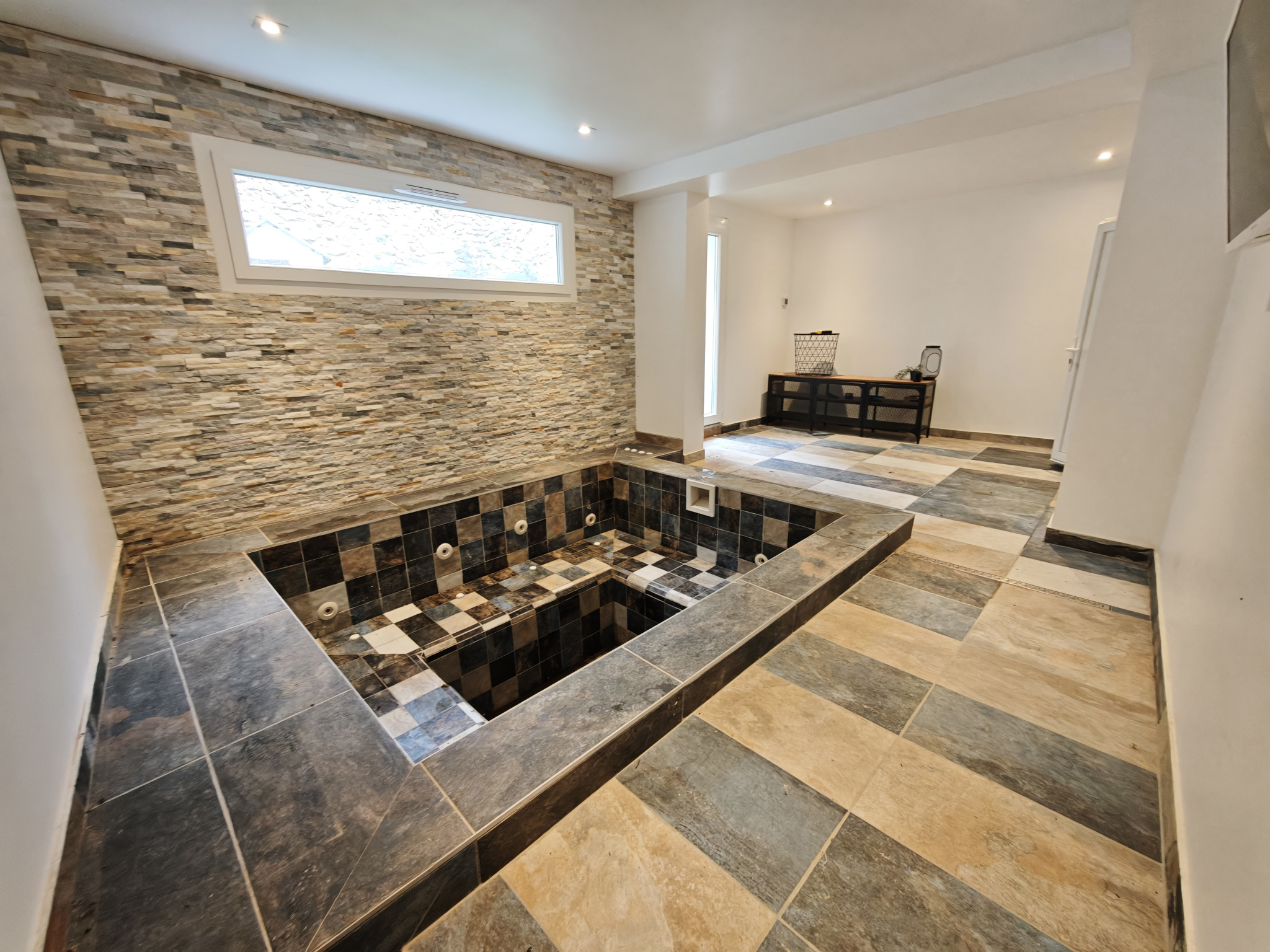 Rez-de-chaussée : un garage avec salle d’eau et possibilité d’aménager une chambre supplémentaire (travaux en cours), ainsi qu’un superbe espace spa ouvrant sur une cour intérieure sans vis-à-vis, parfaite pour des moments de détente.