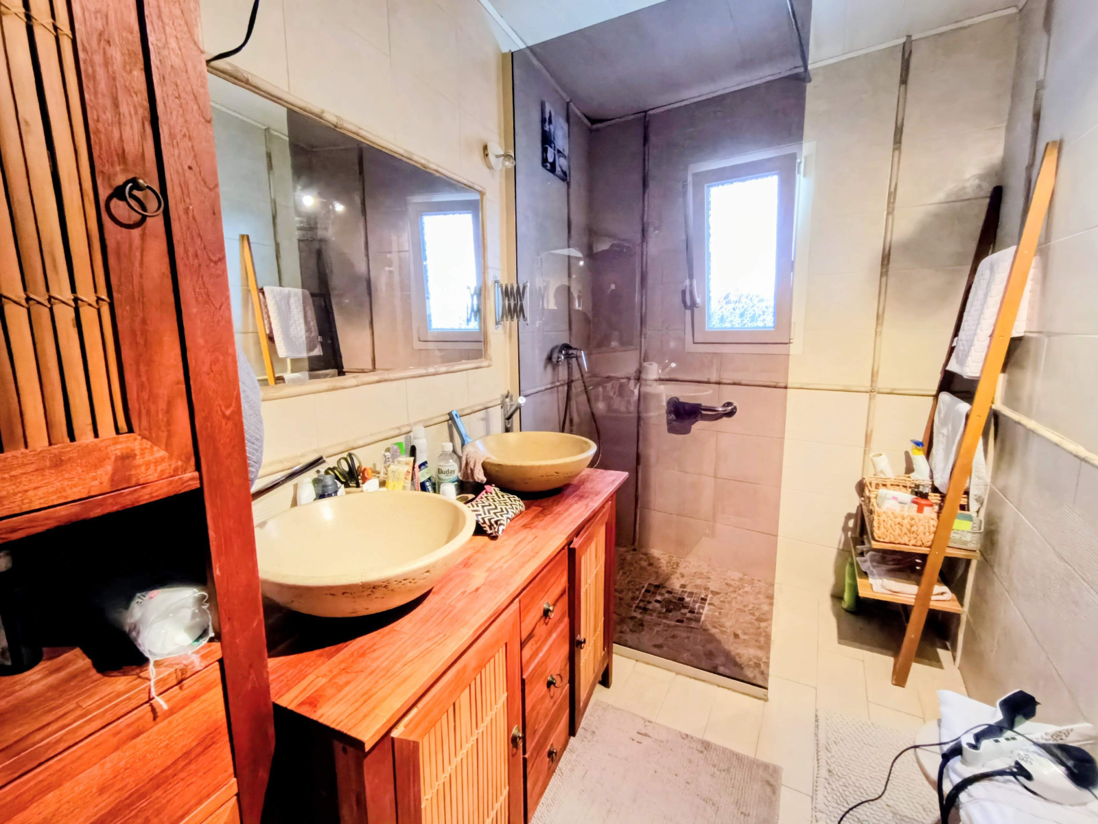 Beaucoup de travaux ont été réalisés : climatisation dans toutes les pièces (partie principale), isolation intégrale des deux habitations, menuiseries en double vitrage, électricité refaite.
