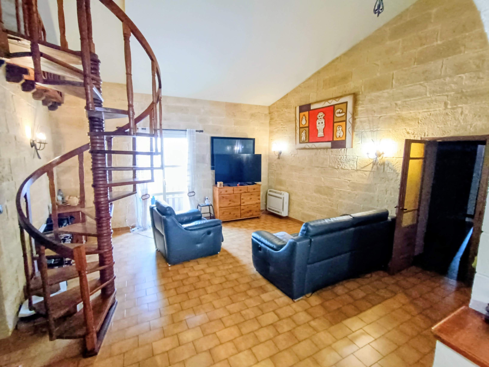 Habitation principale avec accès en rez de chaussée de 120m2. On trouve une très belle cuisine avec sa salle à manger d'environ 29m2 qui donne par une belle ouverture en pierre à un salon/séjour agréable d'environ 25m2 avec mezzanine . On trouve une salle d'eau avec douche à l'italienne, un wc séparé. A ce niveau, deux chambres avec placards. A l'étage deux grandes chambres.