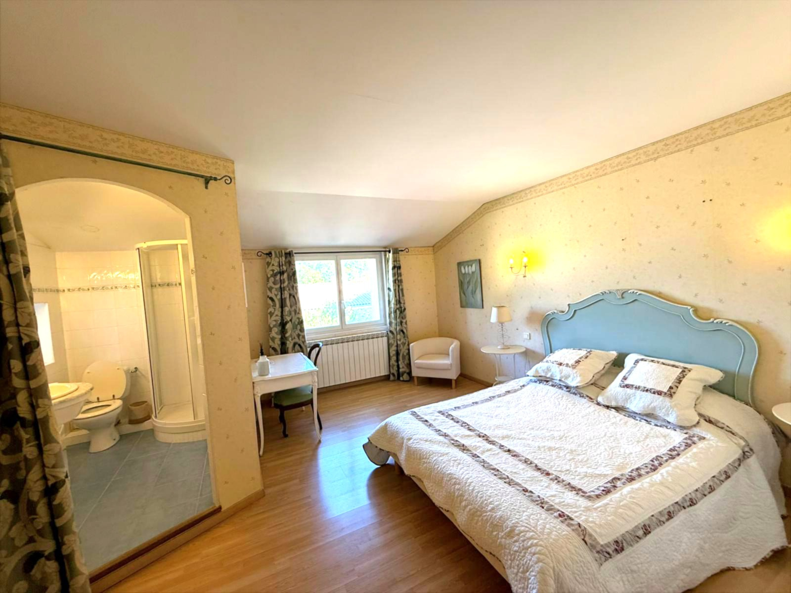 Les chambres se situent aux deux étages supérieurs : 6 grandes chambres dont 4 véritables suites avec salle d’eau privative. La cheminée en marbre du salon et les luminaires en cristal témoignent du soin apporté à la rénovation, complétée par du mobilier haut de gamme (valeur estimée : 27 500 €).
