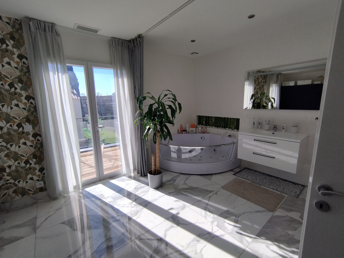 À l’étage, trois chambres dont une suite parentale avec baignoire d’angle balnéo et terrasse privative, ainsi qu’une salle de bain.
