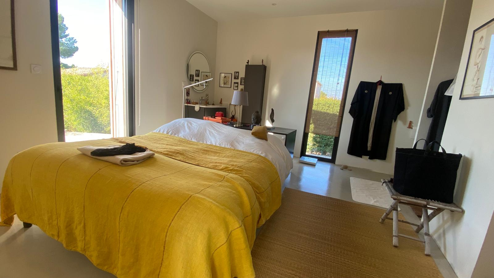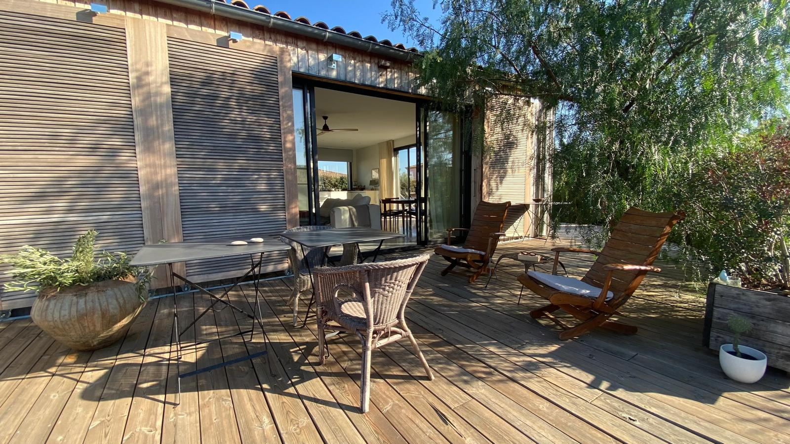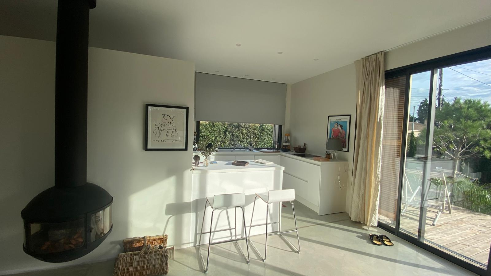 Construite en ossature bois, elle offre un confort thermique exceptionnel été comme hiver, grâce à un poêle Focus suspendu et une climatisation réversible couvrant l’ensemble. L’architecture met en valeur de larges ouvertures protégées par des volets bois coulissants, qui filtrent la lumière et soulignent le caractère contemporain de la villa.