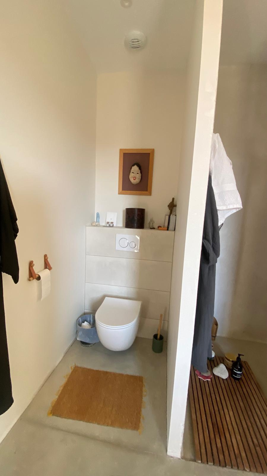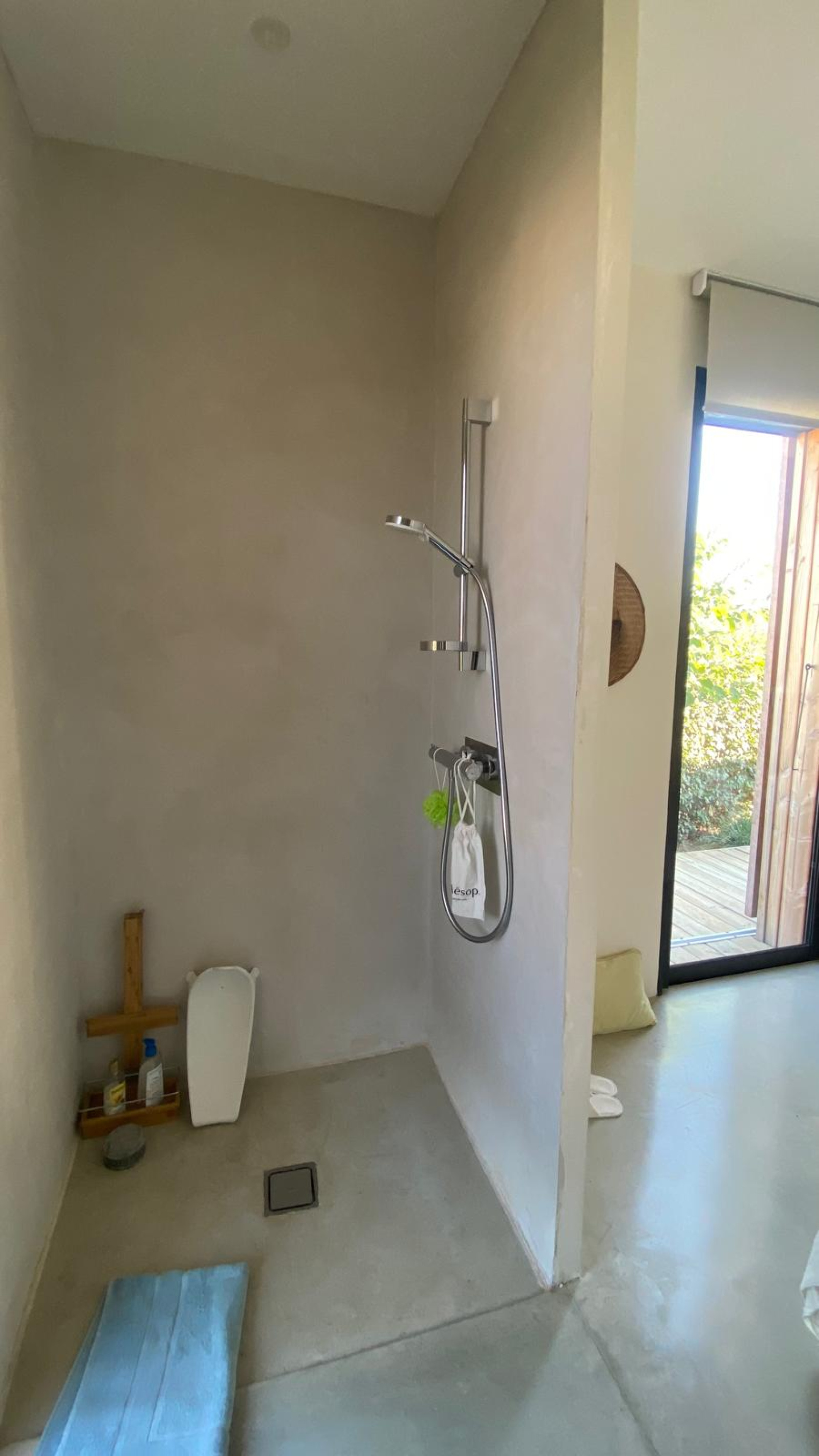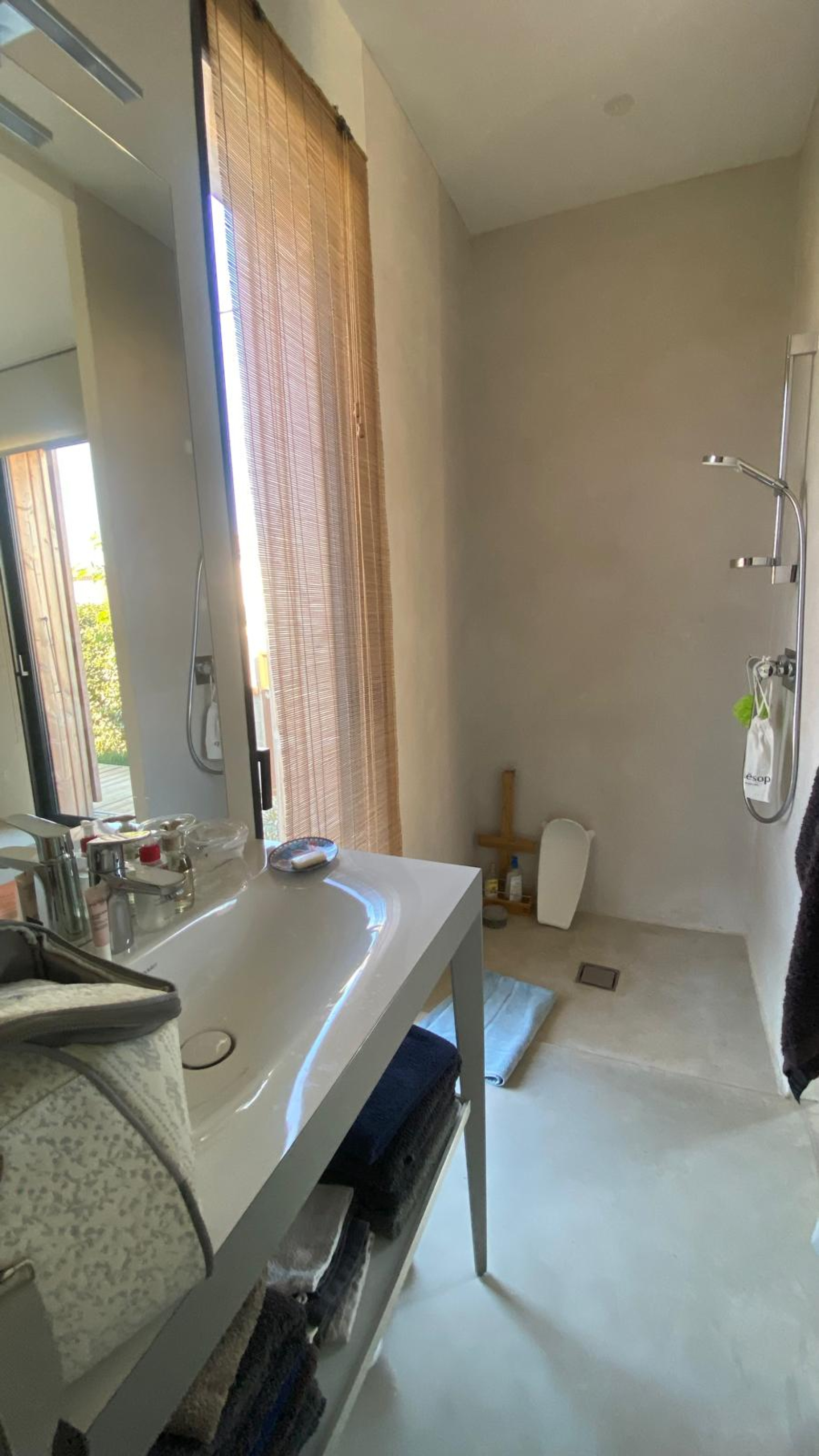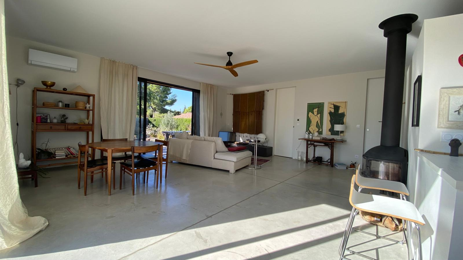 Construite en ossature bois, elle offre un confort thermique exceptionnel été comme hiver, grâce à un poêle Focus suspendu et une climatisation réversible couvrant l’ensemble. L’architecture met en valeur de larges ouvertures protégées par des volets bois coulissants, qui filtrent la lumière et soulignent le caractère contemporain de la villa.