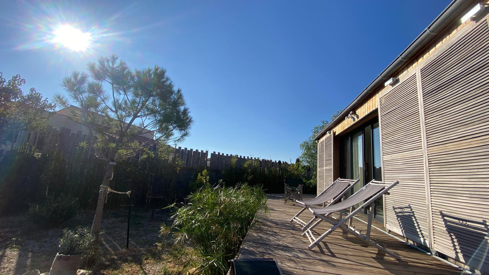 À l’extérieur, une terrasse bois d’environ 70 m² entoure la maison et prolonge naturellement les espaces de vie.